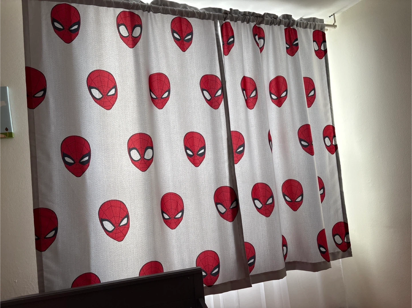 Set of two curtains featuring a classic Spider-Man mask pattern. Adds a fun, superhero touch to any room. Grey trim along the top and sides.