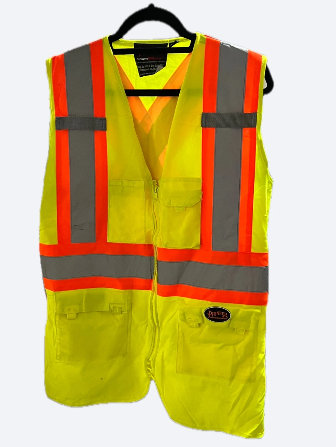 Selling a Pioneer high-visibility safety vest in yellow. It features reflective stripes for enhanced visibility and multiple pockets for convenient storage. Great for construction, road work, or any job requiring high visibility!