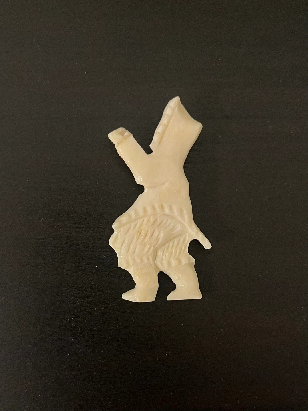 This is a small vintage pin, an intricately carved figure of an Inuit man made from Ivory. It depicts a person in traditional clothing with a feathered design on their Jacket. This piece is hand-crafted. Pin is 2 inches tall & 1 inch wide. It's a unique decorative item.