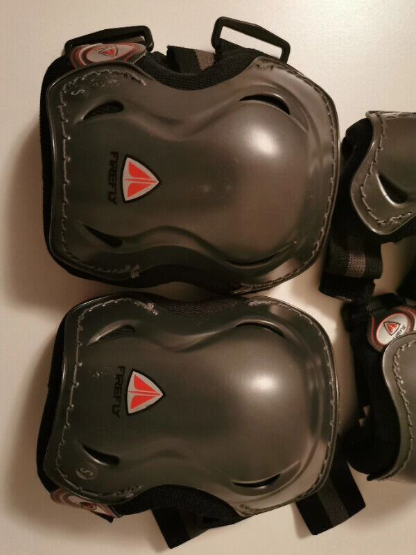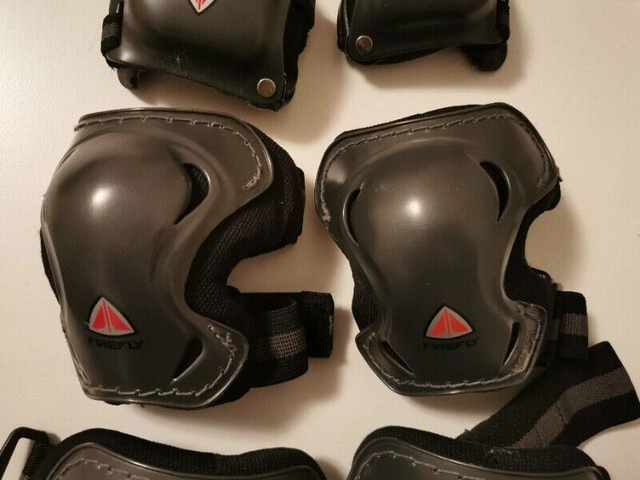 Used - Like new. This is a 6-piece set of Firefly Sportline protective gear, including knee pads, elbow pads, and wrist guards. They are suitable for various sports like cycling, rollerblading, and skateboarding. The gear is black/gray and features adjustable straps for a comfortable fit.