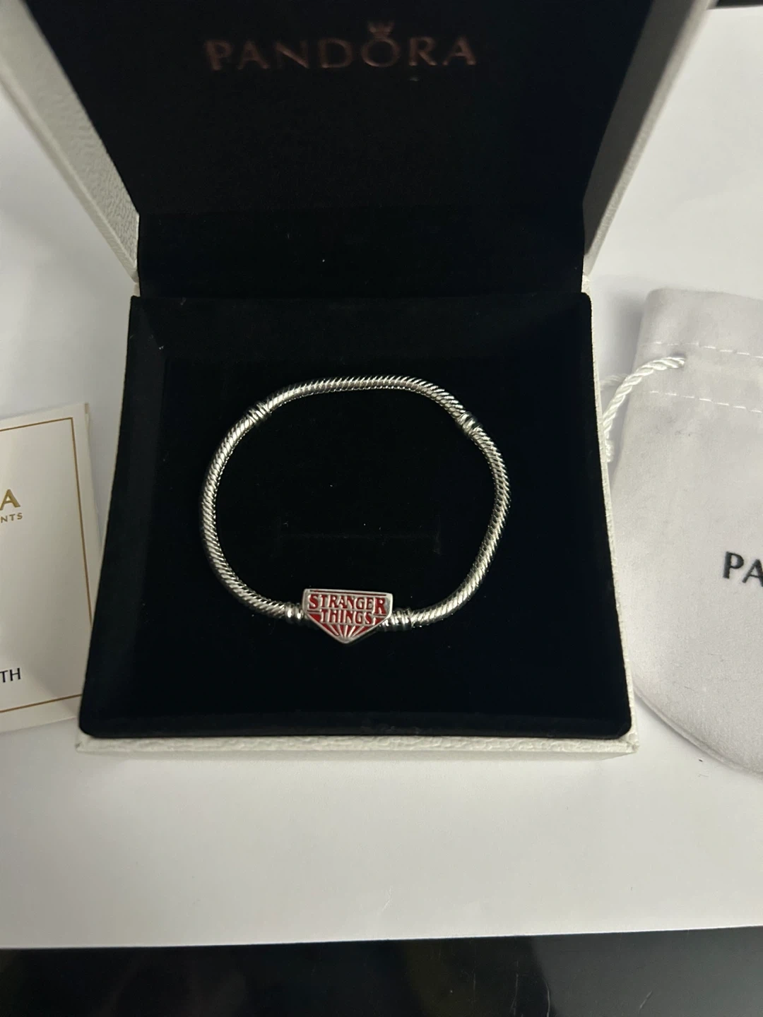 Sterling silver bracelet with a Stranger Things themed clasp REP. Includes Pandora box. This bracelet's clasp reads 'Friends Don't Lie' and has the Stranger Things logo. Great for fans of the show!
