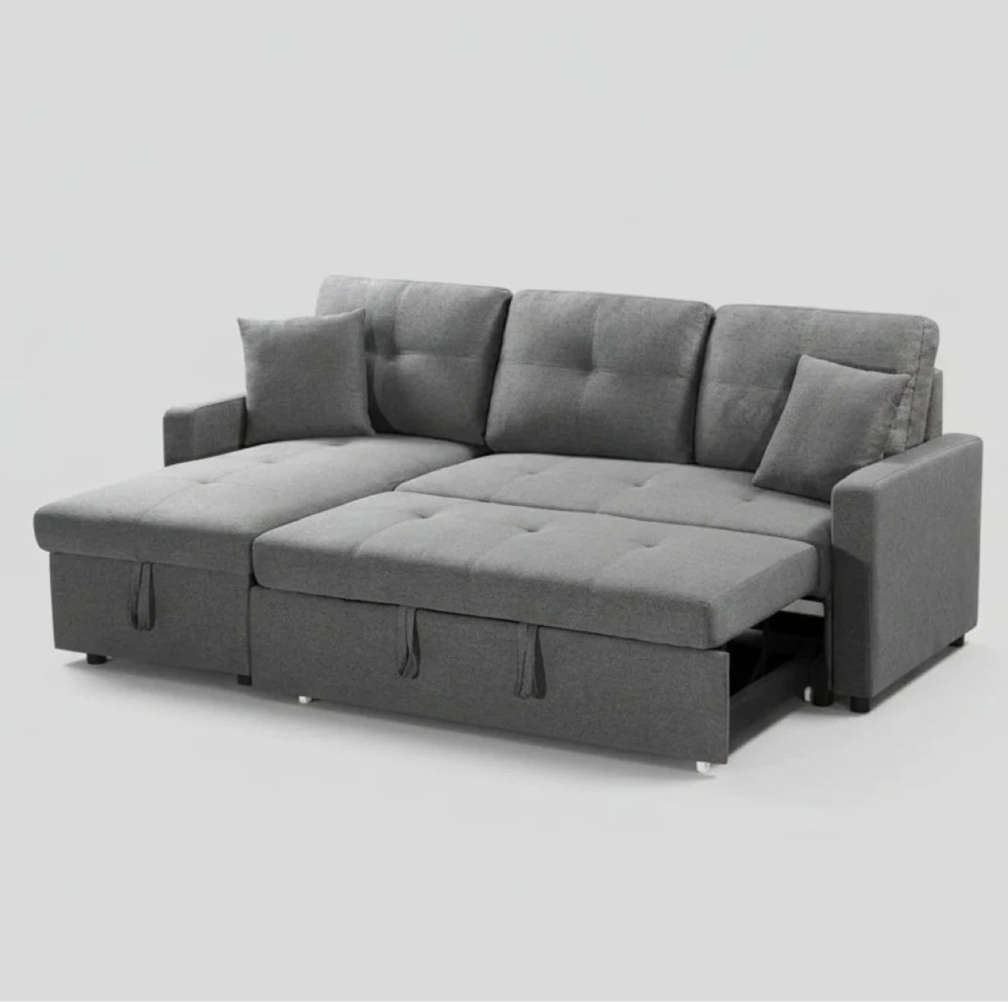 Versatile grey fabric sectional has a pull-out bed and a lift-top storage chaise. Material is a durable woven polyester blend with tufted seat cushions and matching throw pillows. This piece is a space-saving solution for guests and extra storage. (We deliver)
