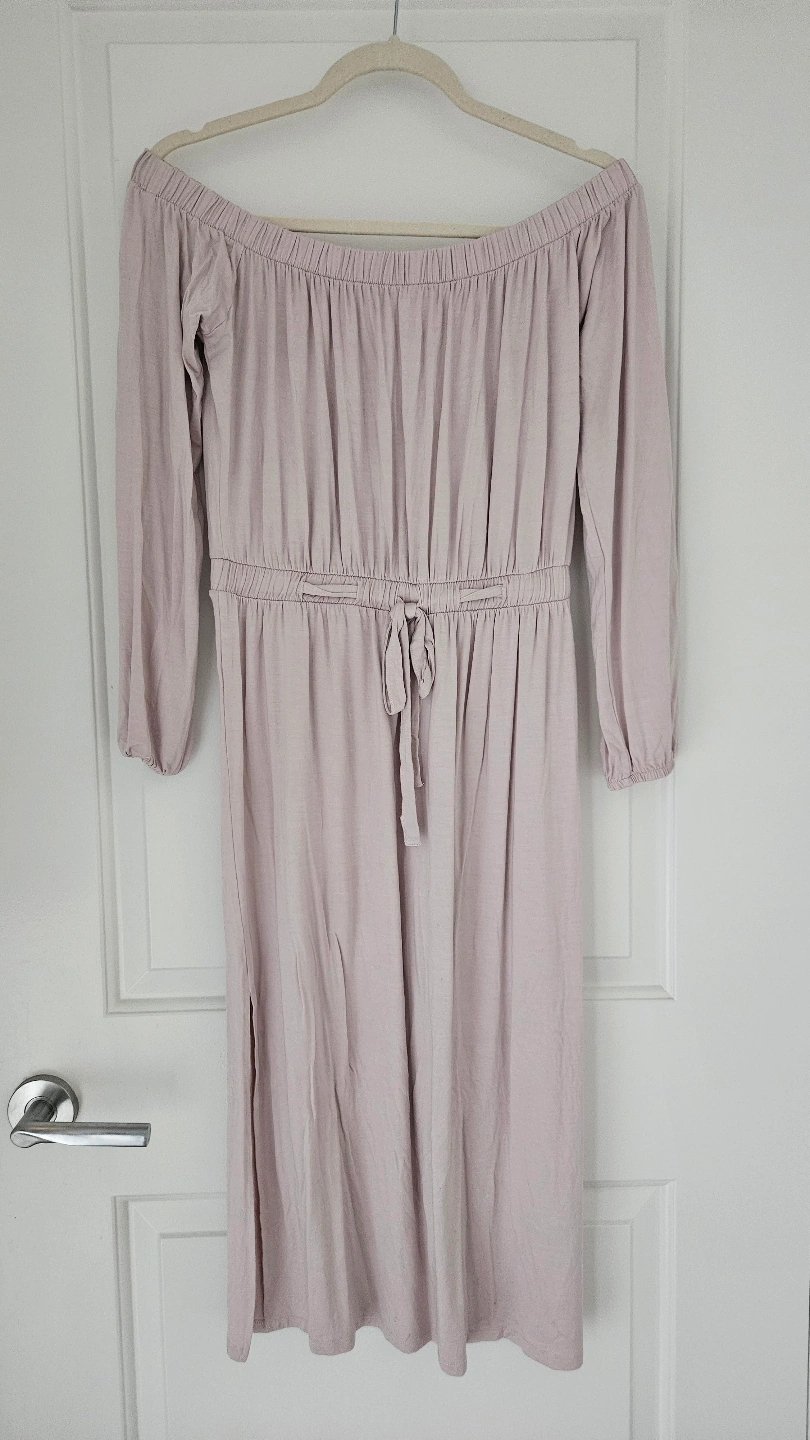 This Wilfred Free dress is in great shape and features a comfortable, stretchy fabric and a stylish off-the-shoulder design. Has a slit on both sides. Perfect for a casual day out or a relaxed evening. This is If the ad is up, it's available! Don't miss out on this comfy dress!