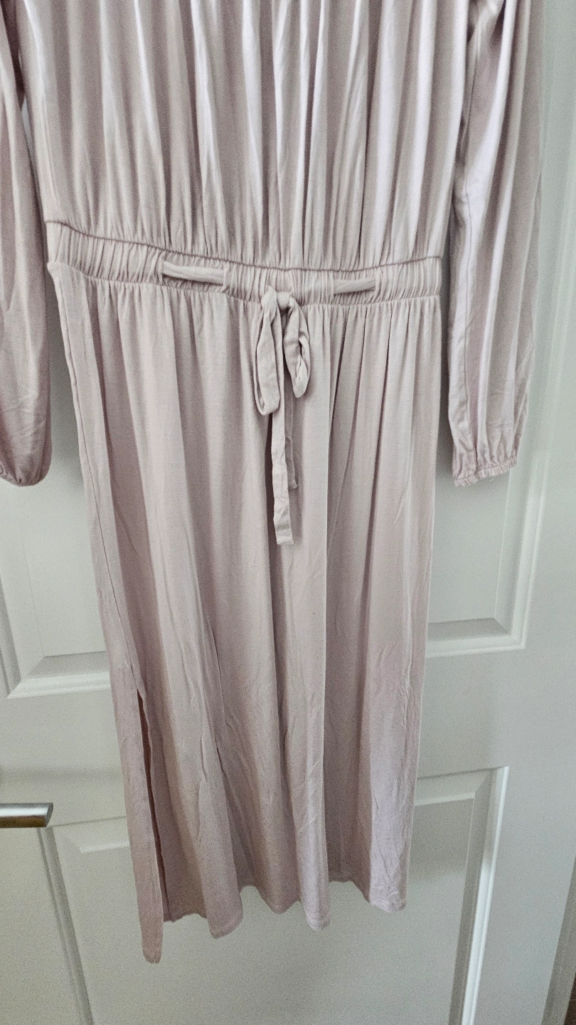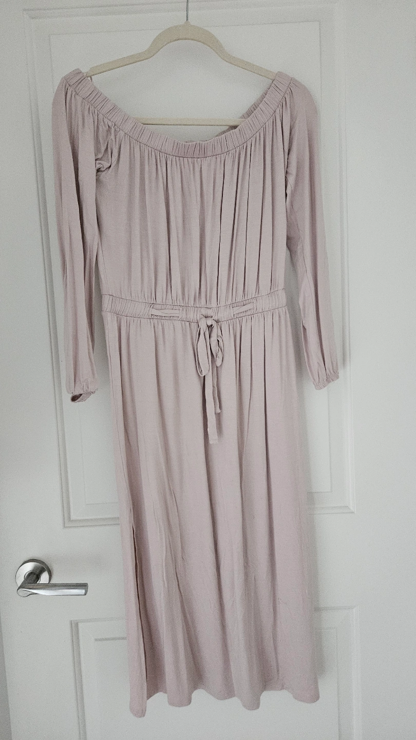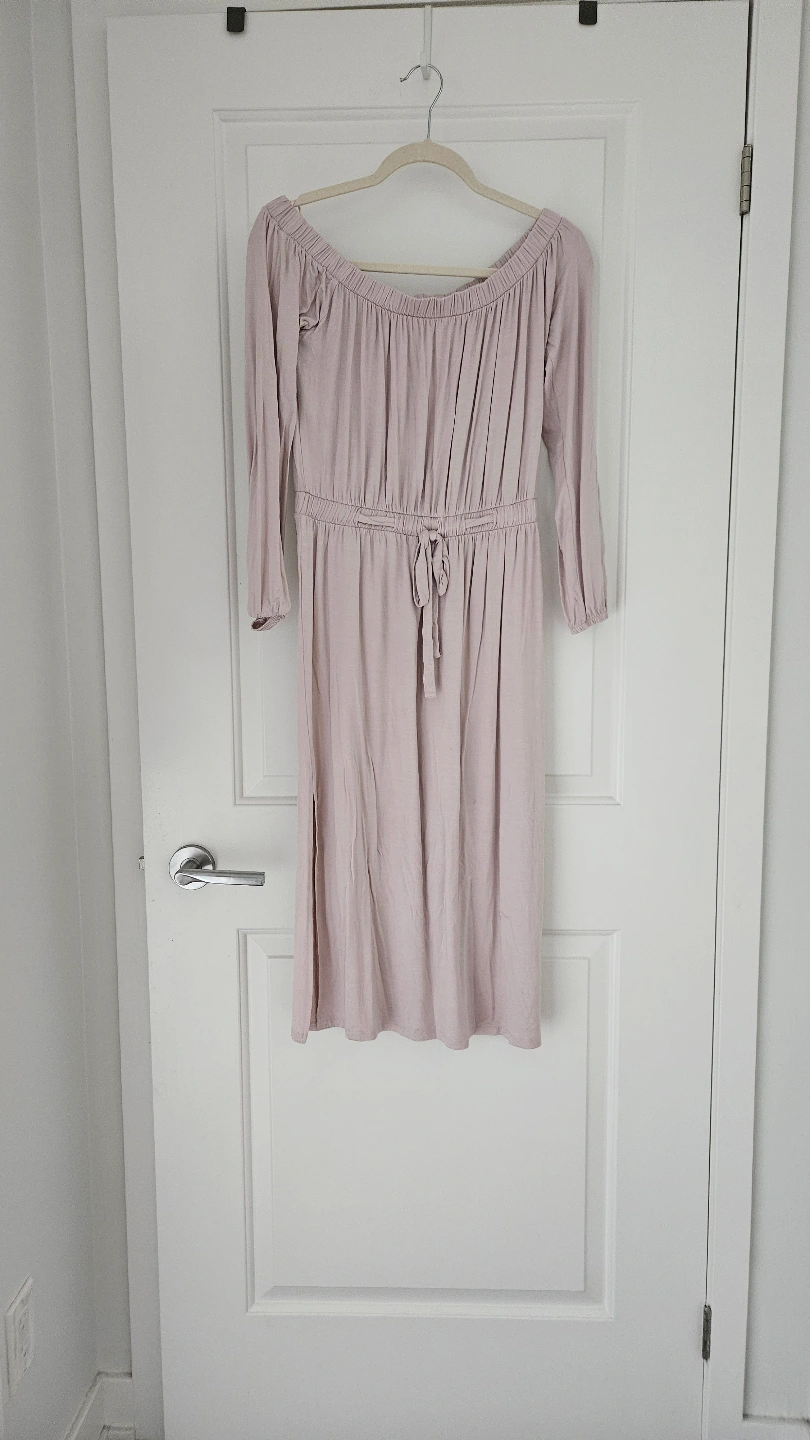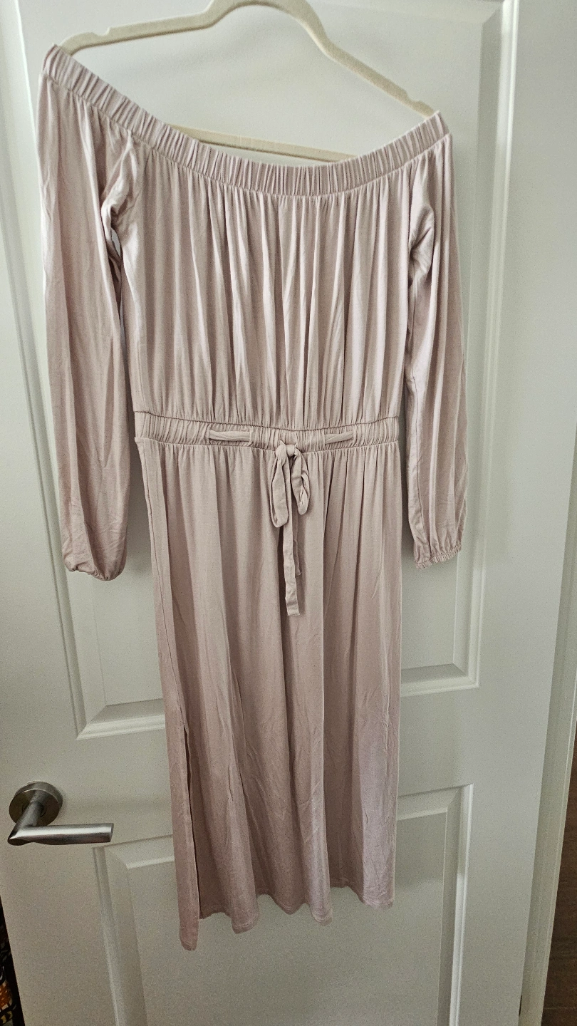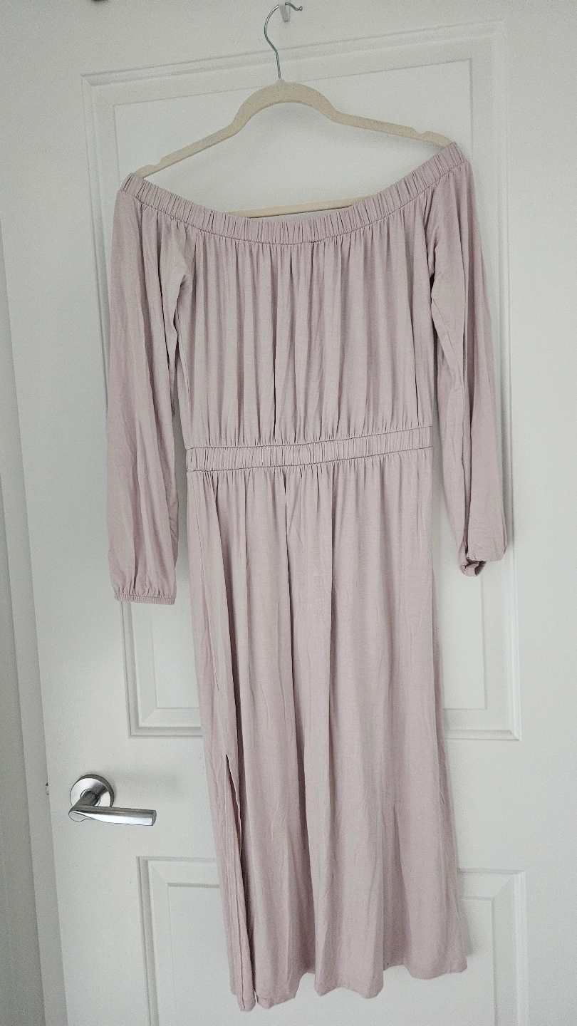 This Wilfred Free dress is in great shape and features a comfortable, stretchy fabric and a stylish off-the-shoulder design. Has a slit on both sides. Perfect for a casual day out or a relaxed evening. This is If the ad is up, it's available! Don't miss out on this comfy dress!