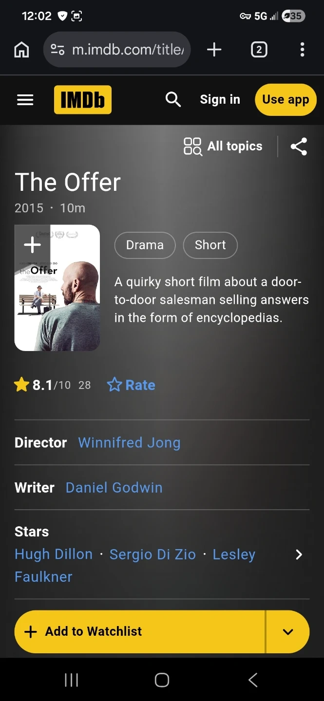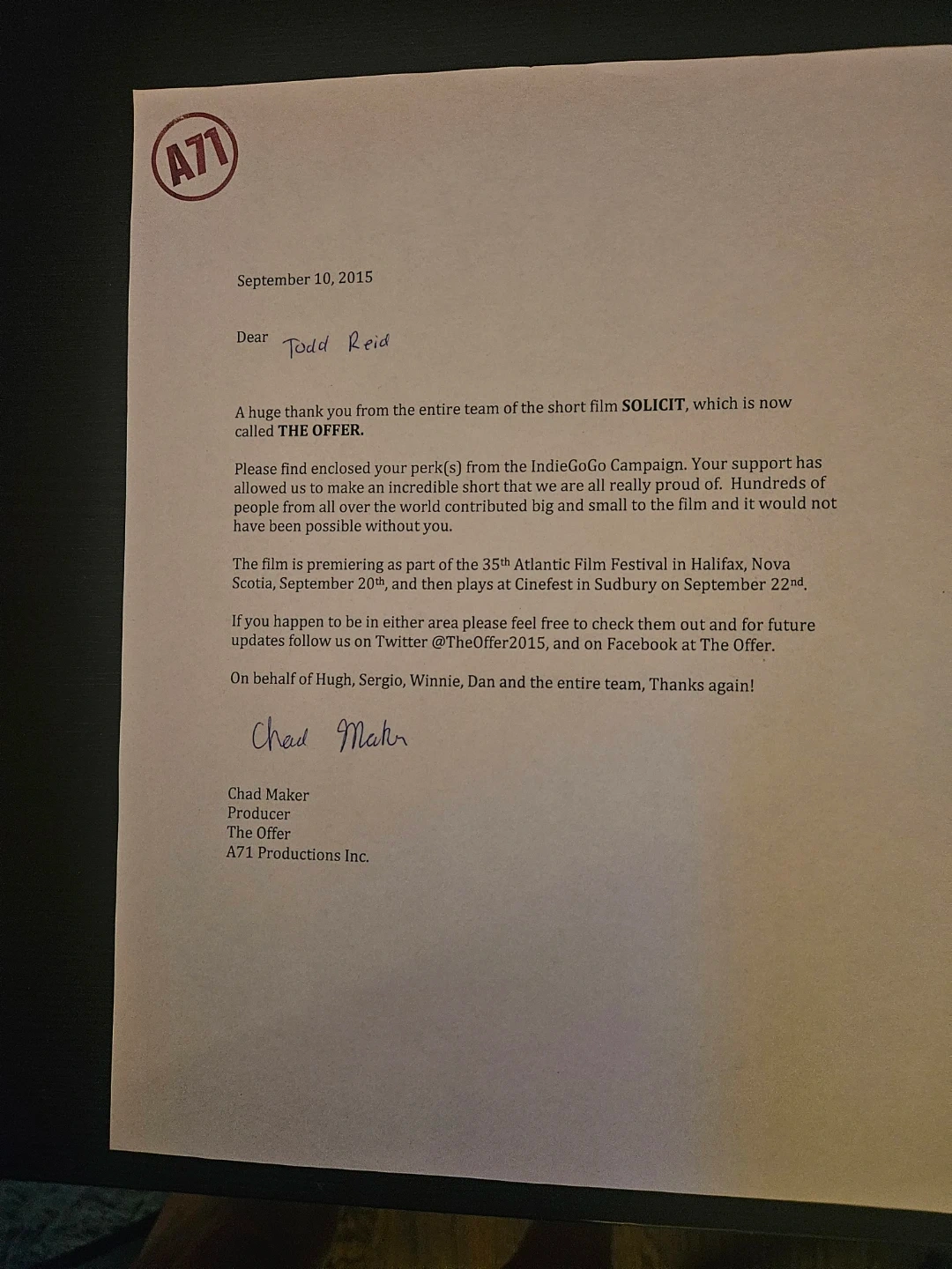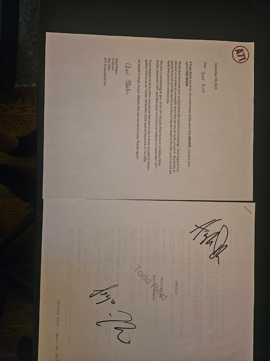 The Offer - Short Film Script - Signed by & Staring Hugh Dillon
