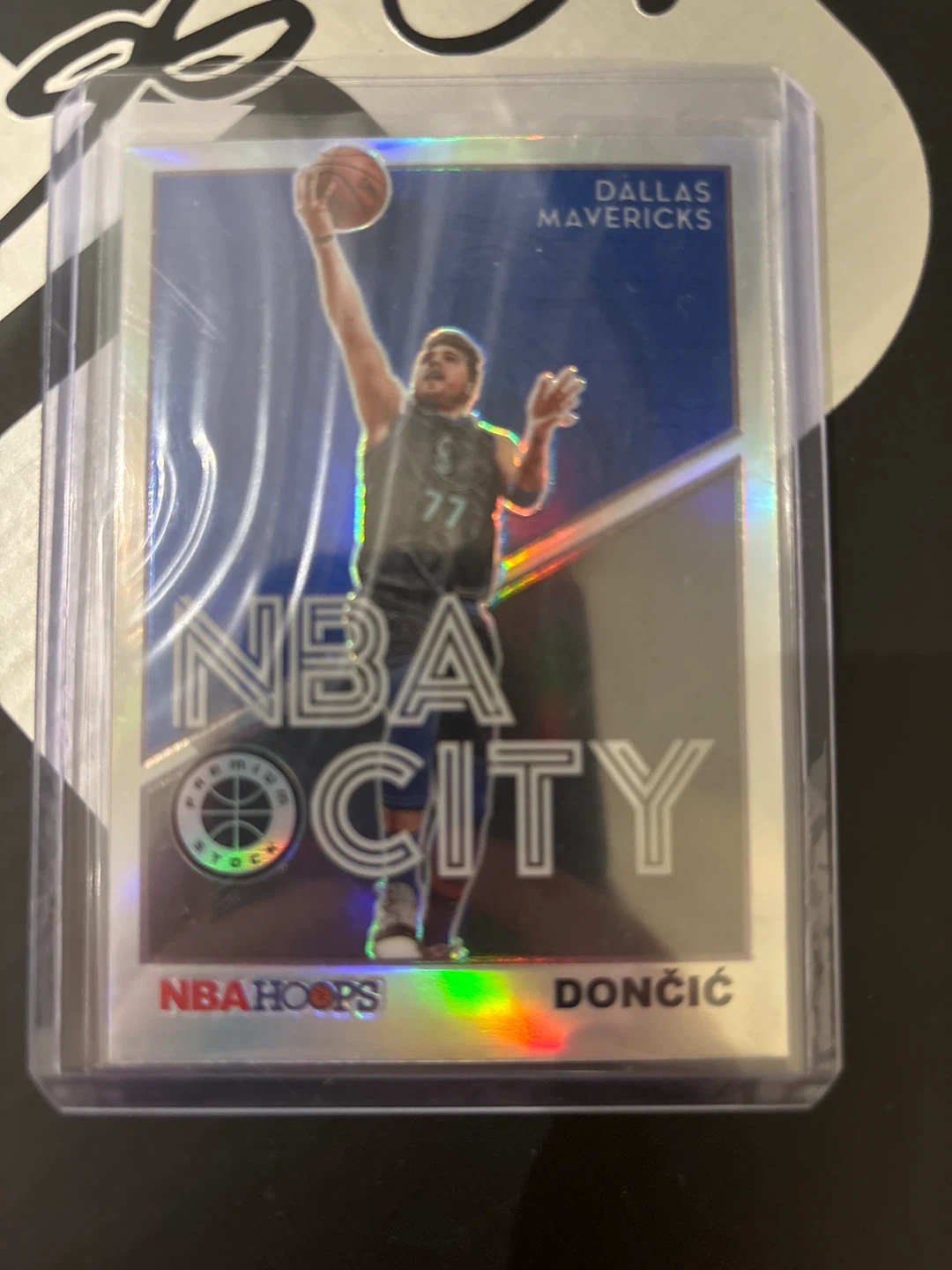 This is a Luka Dončić NBA Hoops NBA City basketball card. It features the Dallas Mavericks player. Card includes 'Premium Stock' designation. Mint condition