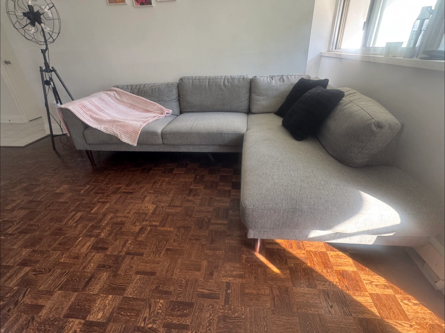 Selling a comfortable grey sectional sofa. It's in great shape and ready for a new home. Perfect for lounging and adding a stylish touch to your living space!