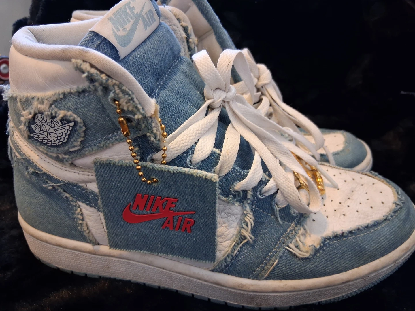These Nike Air Jordan 1 High sneakers feature a denim and white colorway. They've got white laces and gold "Jordan" lace charms. The iconic Air Jordan Wings logo is visible on the side.