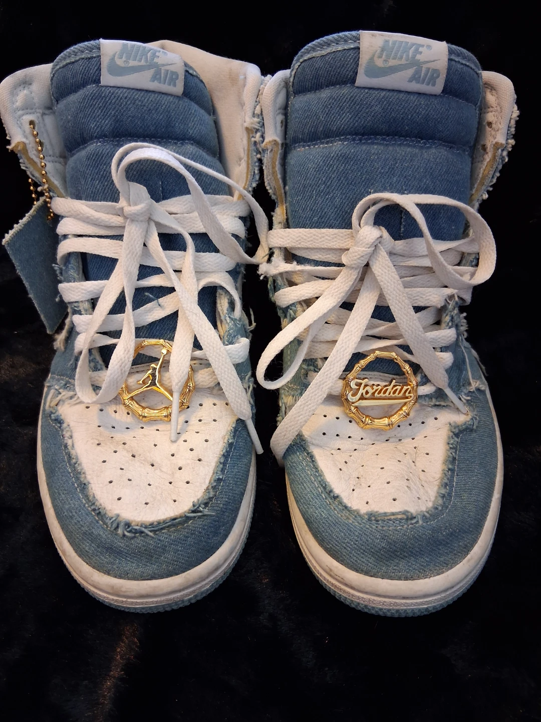 These Nike Air Jordan 1 High sneakers feature a denim and white colorway. They've got white laces and gold "Jordan" lace charms. The iconic Air Jordan Wings logo is visible on the side.