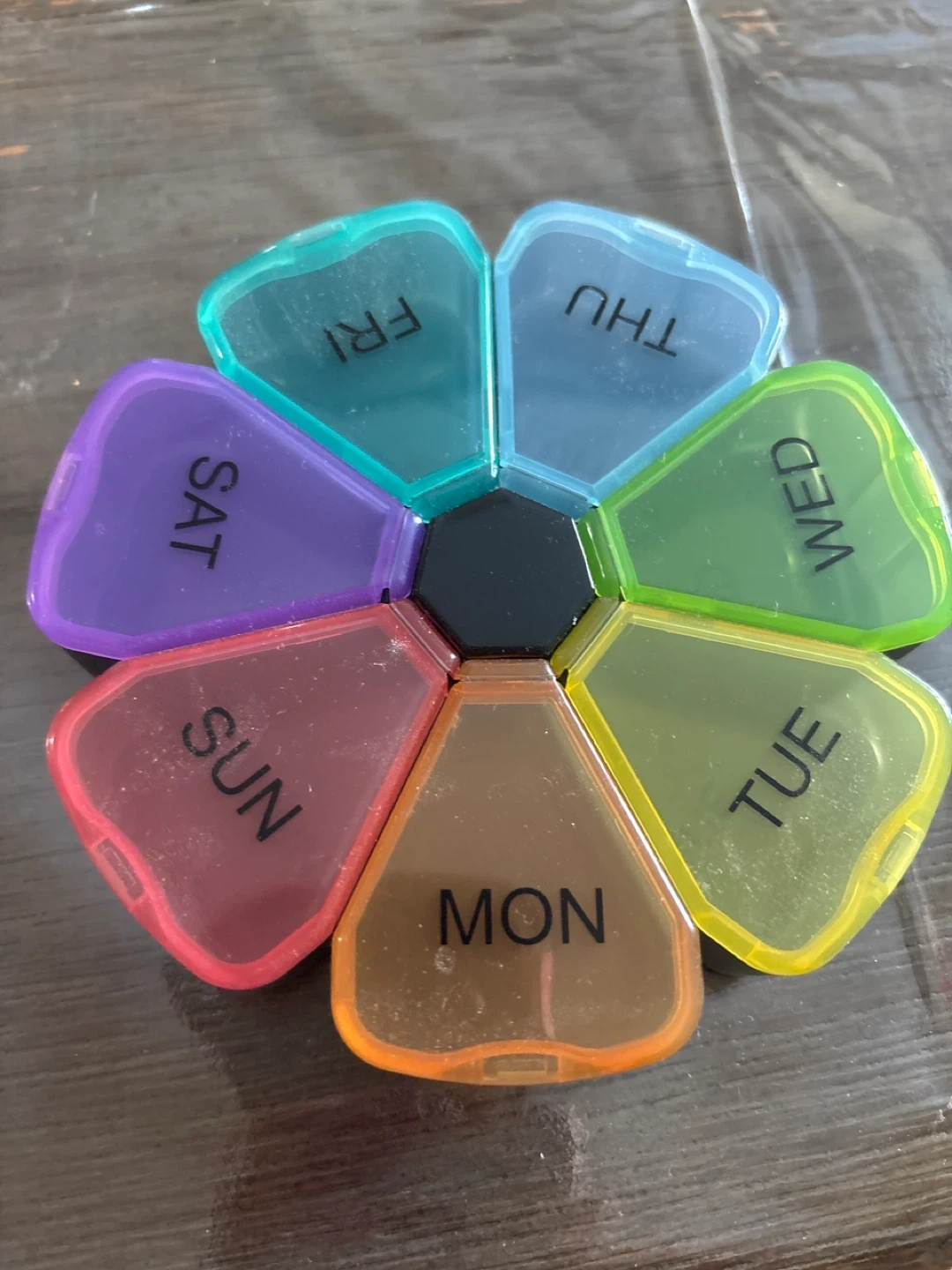 This daily pill organizer has seven compartments, one for each day of the week. It's shaped like a flower and comes in multiple colours. Useful for keeping track of daily medications.