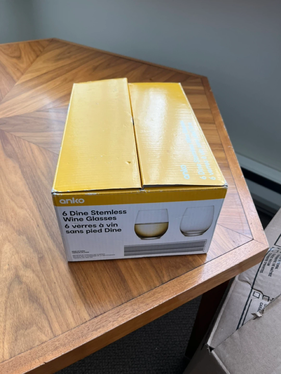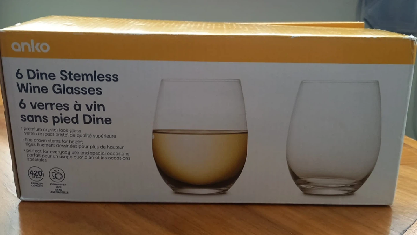 A set of 6 stemless wine glasses from Anko. These glasses are made of fine drawn crystal look glass. They're dishwasher safe and have a capacity of 420 ml.