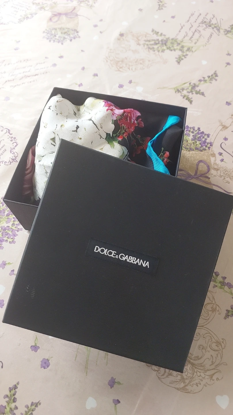 This Dolce & Gabbana scarf features a vibrant floral print with a turquoise border. It's made from silk and comes in its original box. It's a beautiful accessory for any outfit!
