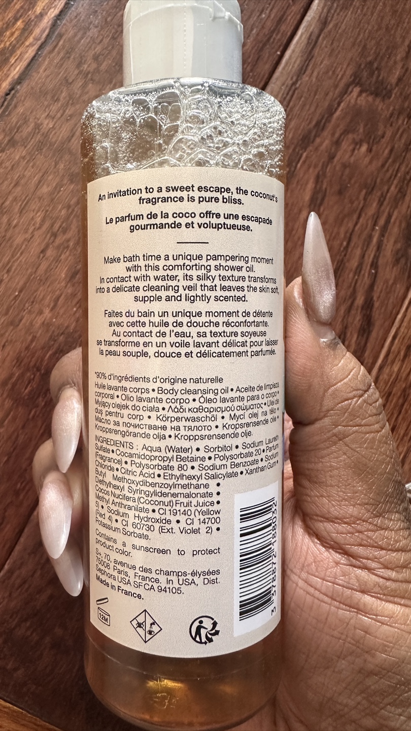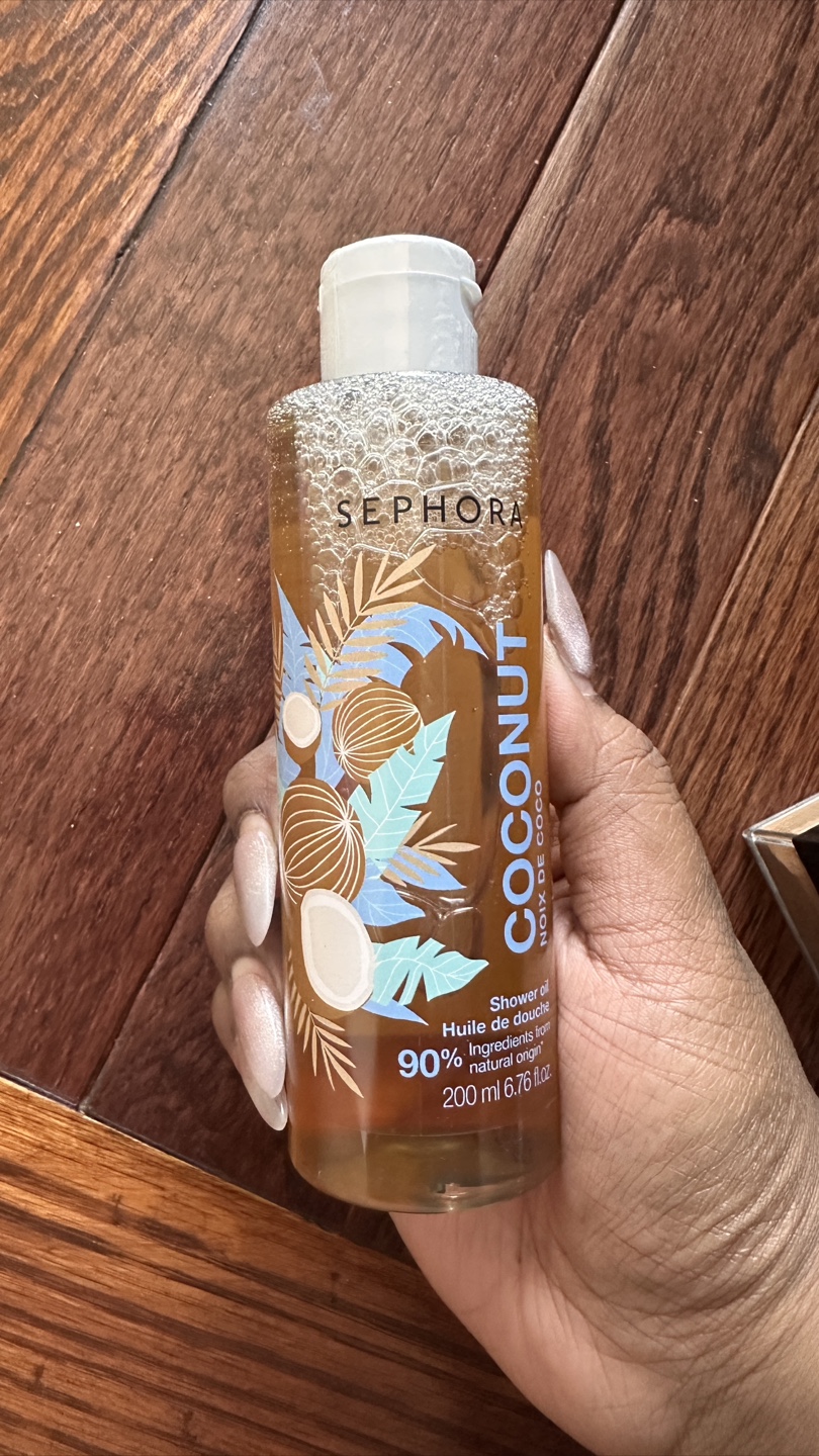 Selling a bottle of Sephora Coconut shower oil. It's a body cleansing oil made with 90% natural origin ingredients. The texture transforms with water into a delicate cleansing veil that leaves the skin soft, supple and lightly scented. The bottle contains 200ml (6.76 fl oz)