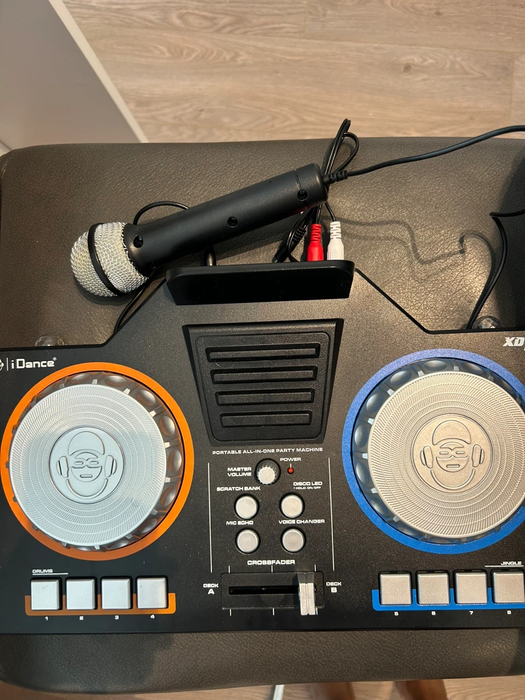 This iDance portable all-in-one party machine is a DJ controller with a microphone. It includes master volume control, scratch bank, and voice changer functions. A great setup for parties!