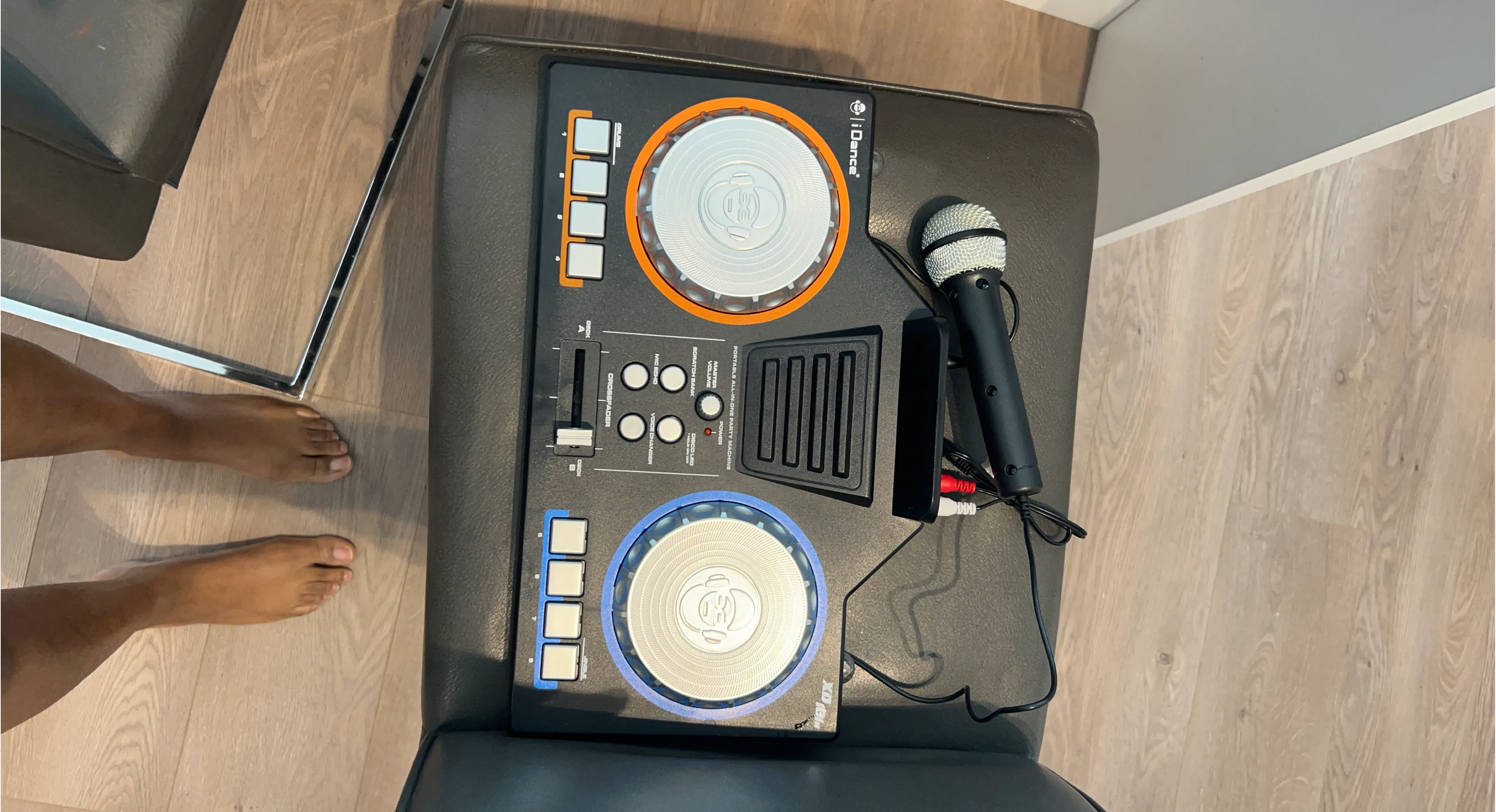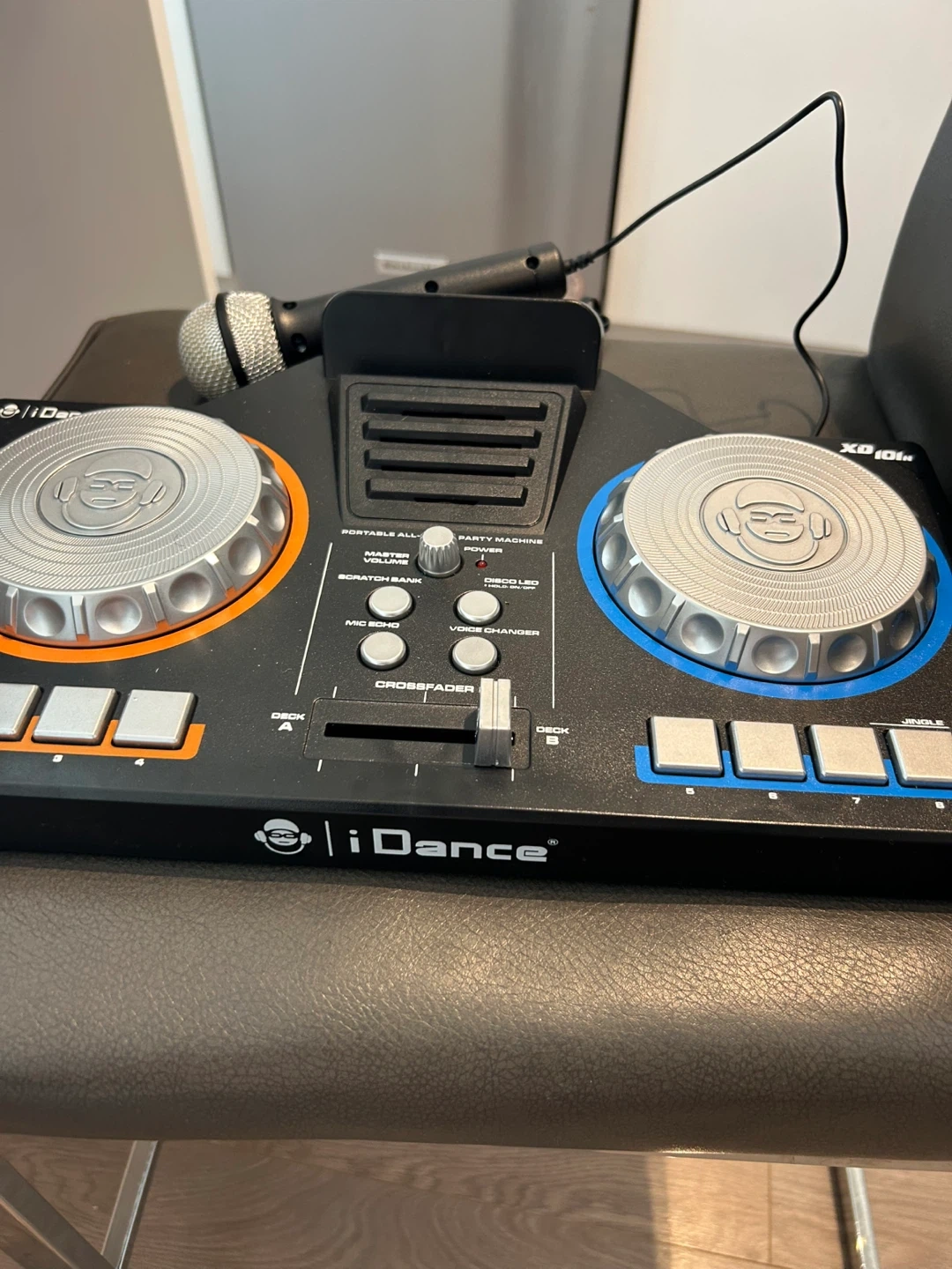 This iDance portable all-in-one party machine is a DJ controller with a microphone. It includes master volume control, scratch bank, and voice changer functions. A great setup for parties!