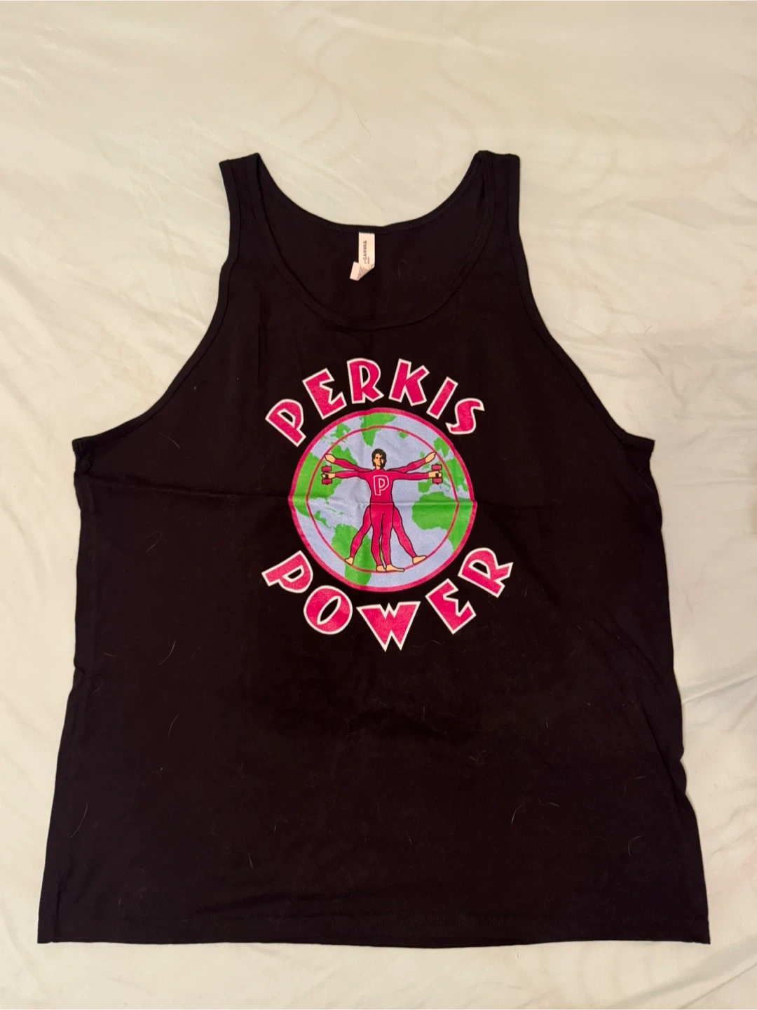 Selling a black men’s tank top with a "Perkis Power" design on the front.