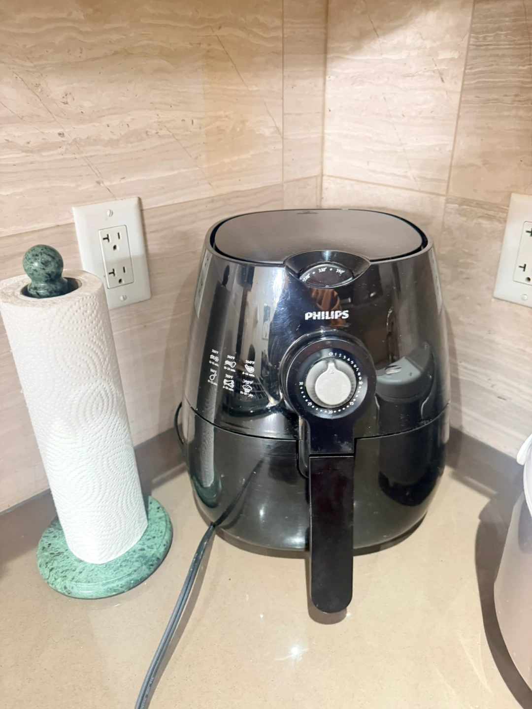 This is a black Philips air fryer. It has a dial for temperature and timer control. Uses minimal oil for healthier cooking.