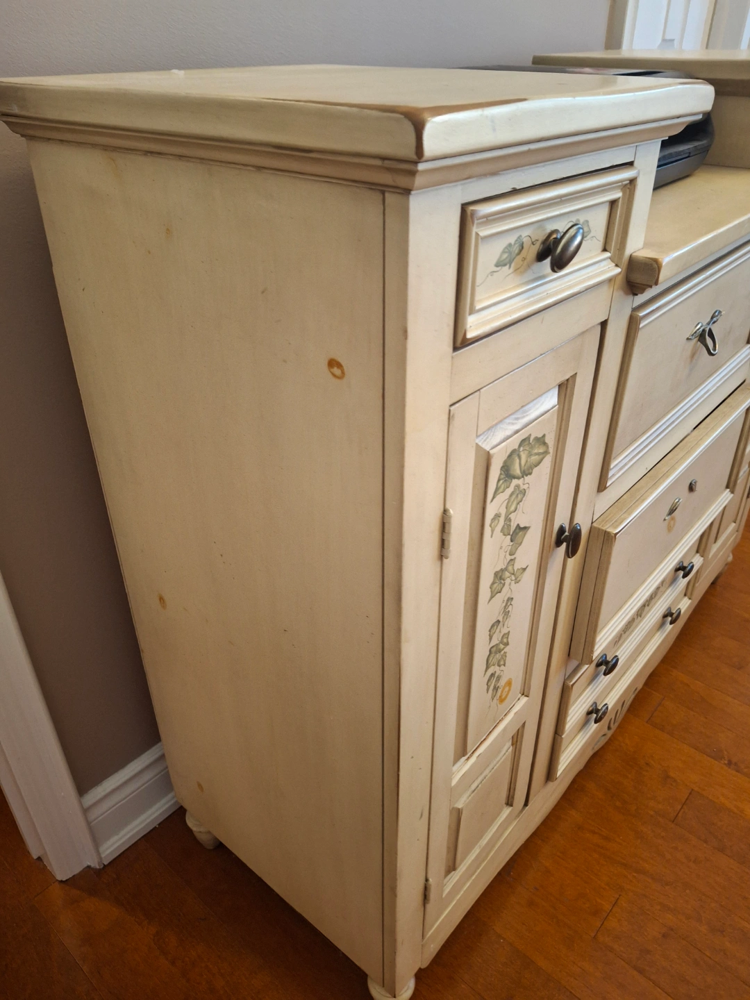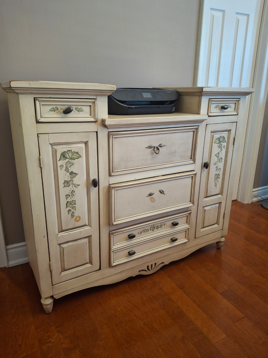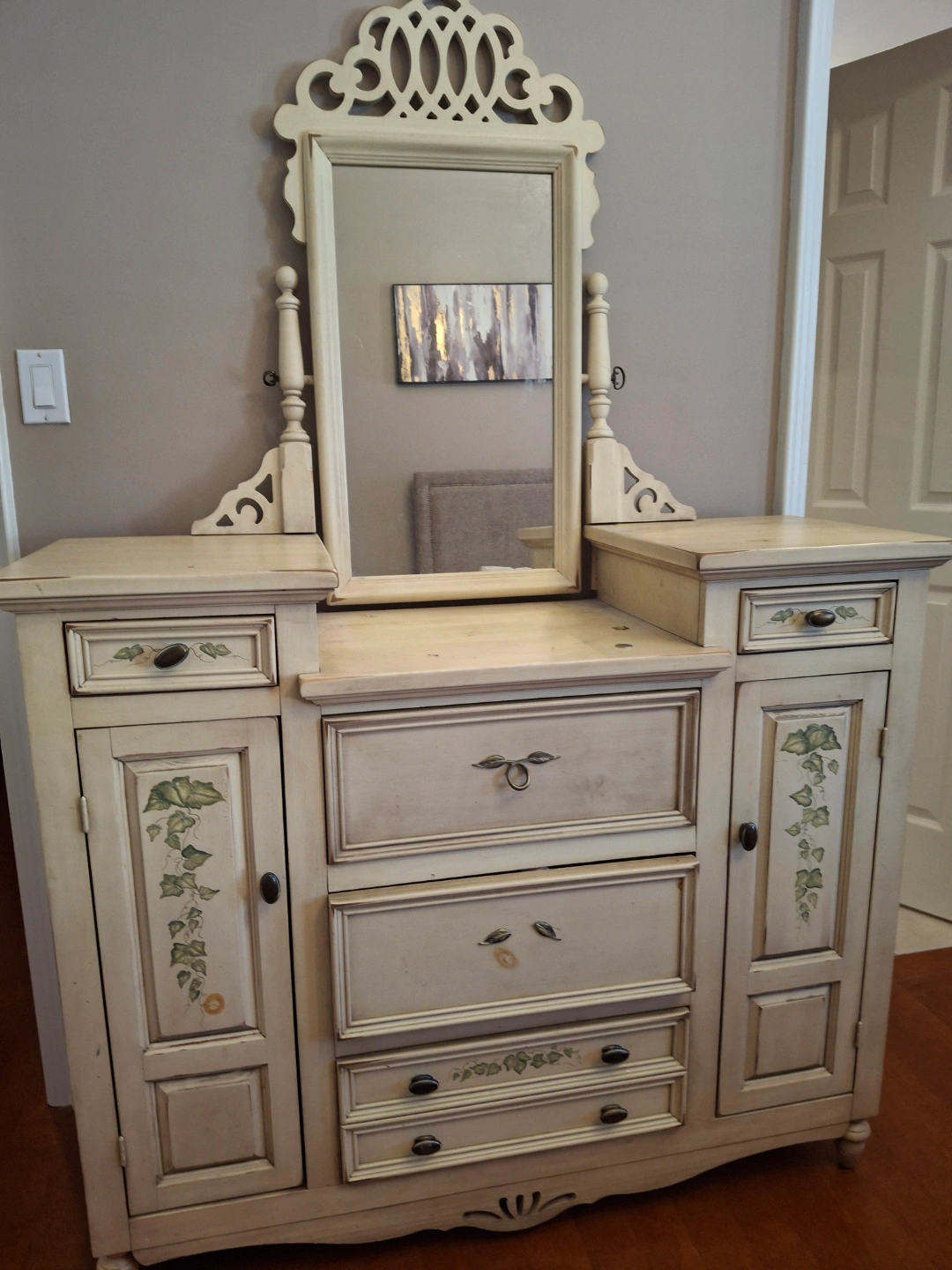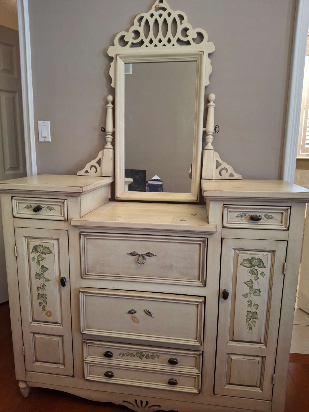 Beautiful antique vanity features a mirror, multiple drawers, and hand-painted detailing. Off-white finish. Excellent storage solution. Measures approximately 50" wide and 41" tall approx.