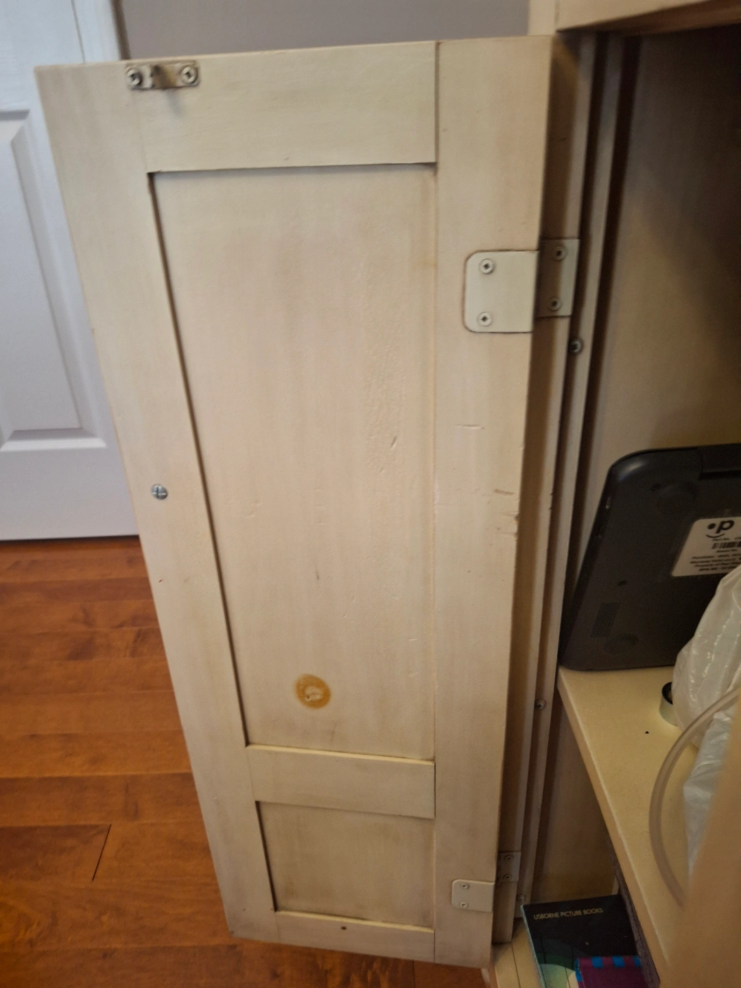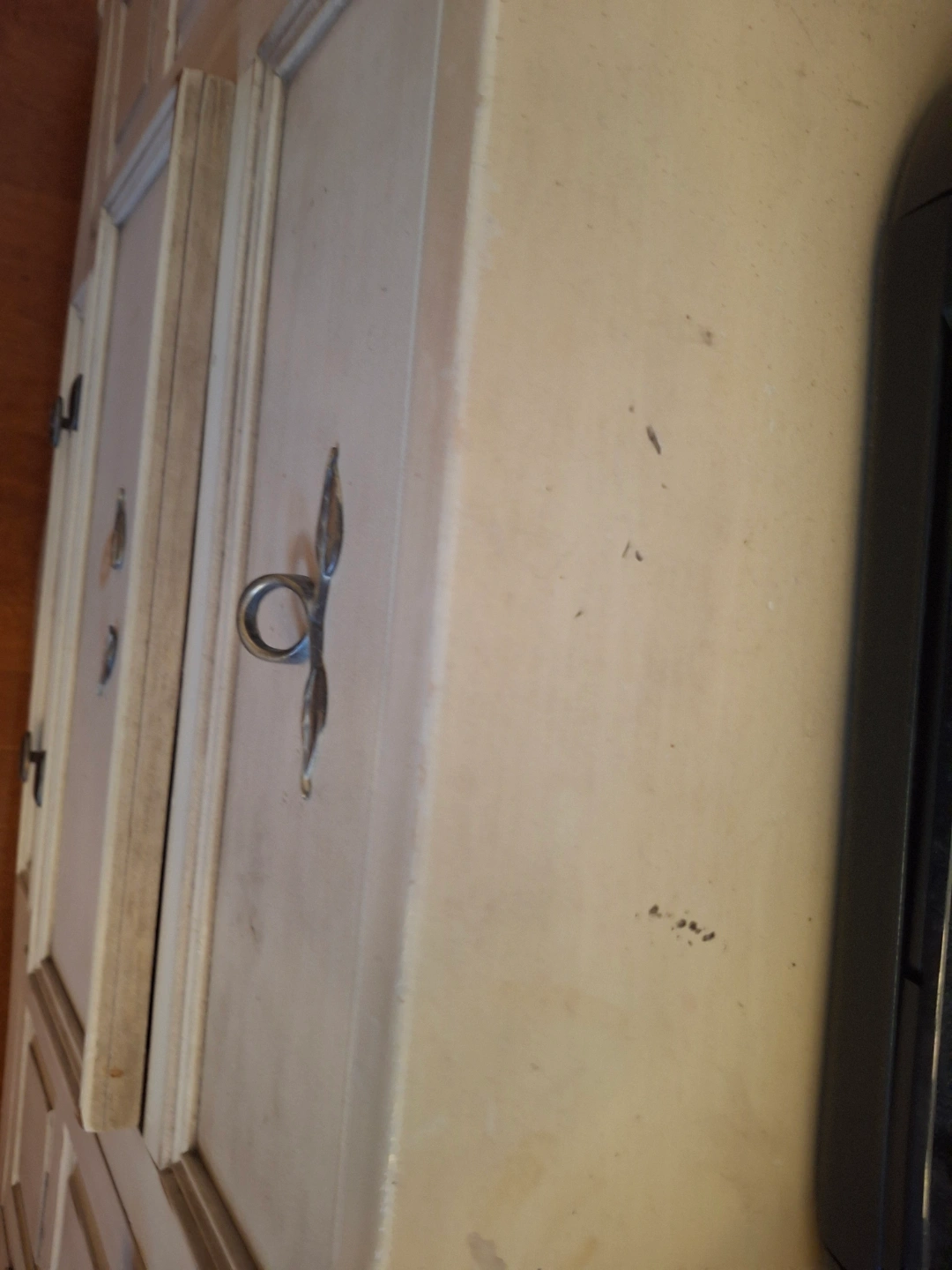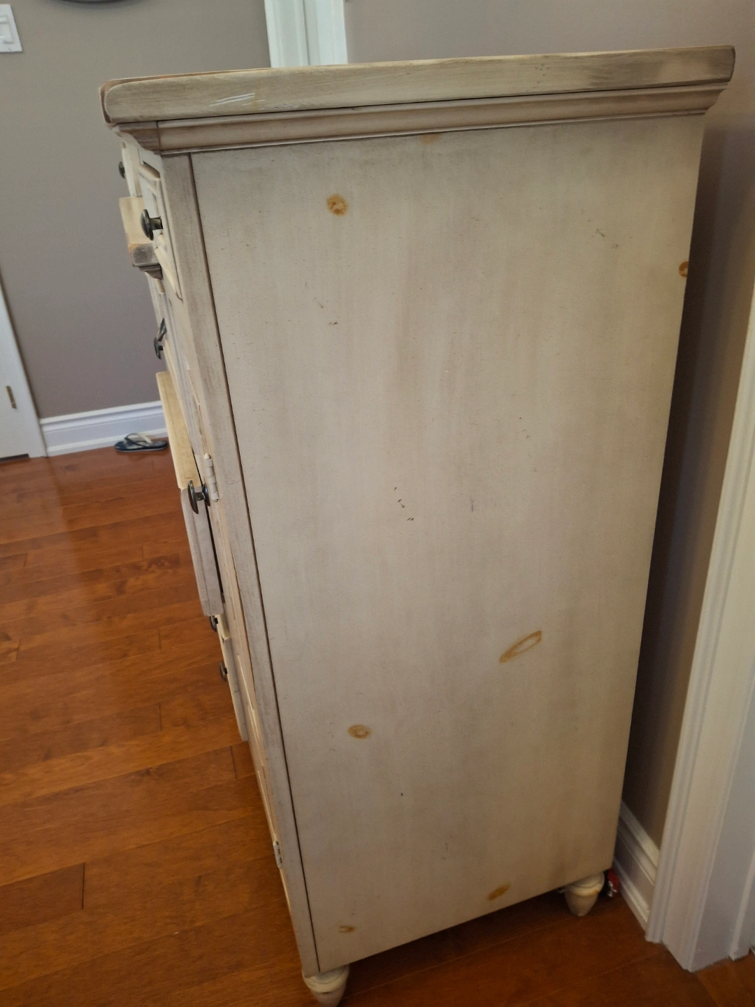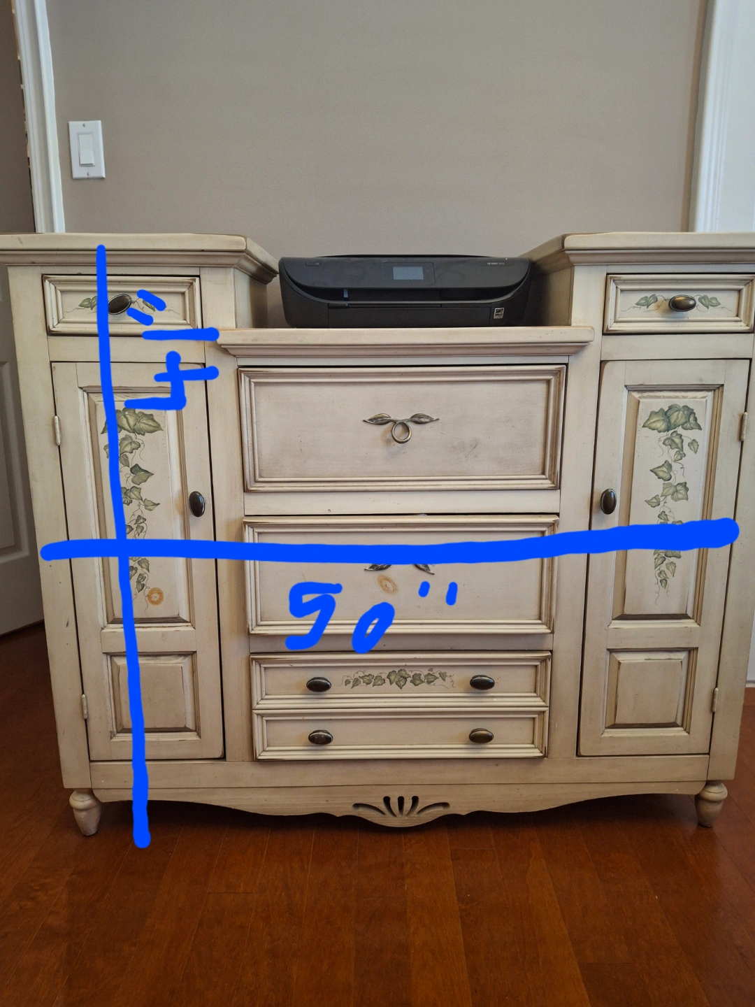 Beautiful antique vanity features a mirror, multiple drawers, and hand-painted detailing. Off-white finish. Excellent storage solution. Measures approximately 50" wide and 41" tall approx.