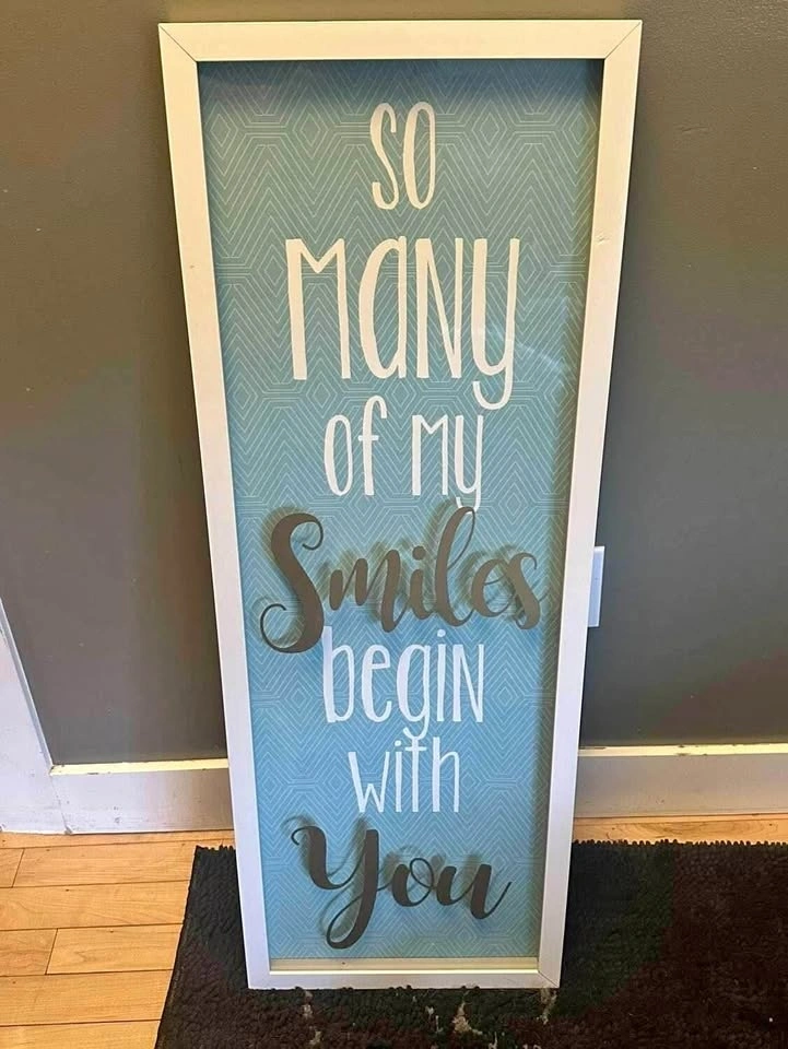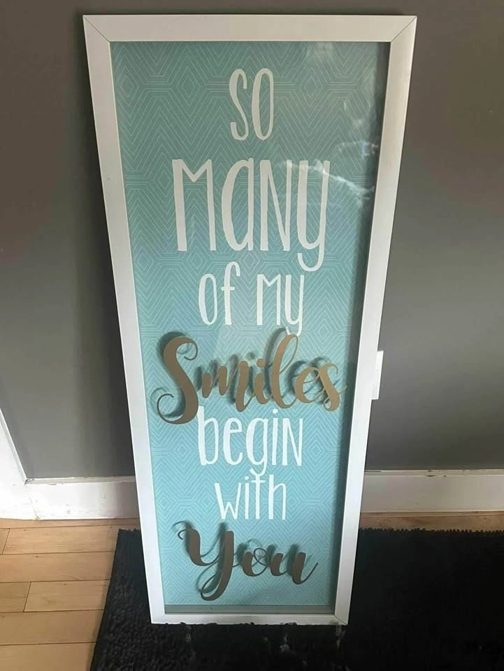 Buy & SellEUC Framed Art Piece: So many of my Smiles begin with youEUC Framed Art Piece: So many of my Smiles begin with you$20Measures 13.5"w x 37.5"t x 1"dWHERE TO MEETCheck LocationView MapSELLERverifiedMelanie DryQuadra650 reviews0 chats·0 favorites·1 viewsSEND CHAT TO SELLERHi Melanie Dry! I’m interested in your listing.Hi Melanie Dry! I’m interested in your listing.Get the Karrot app to chatSign In to chat