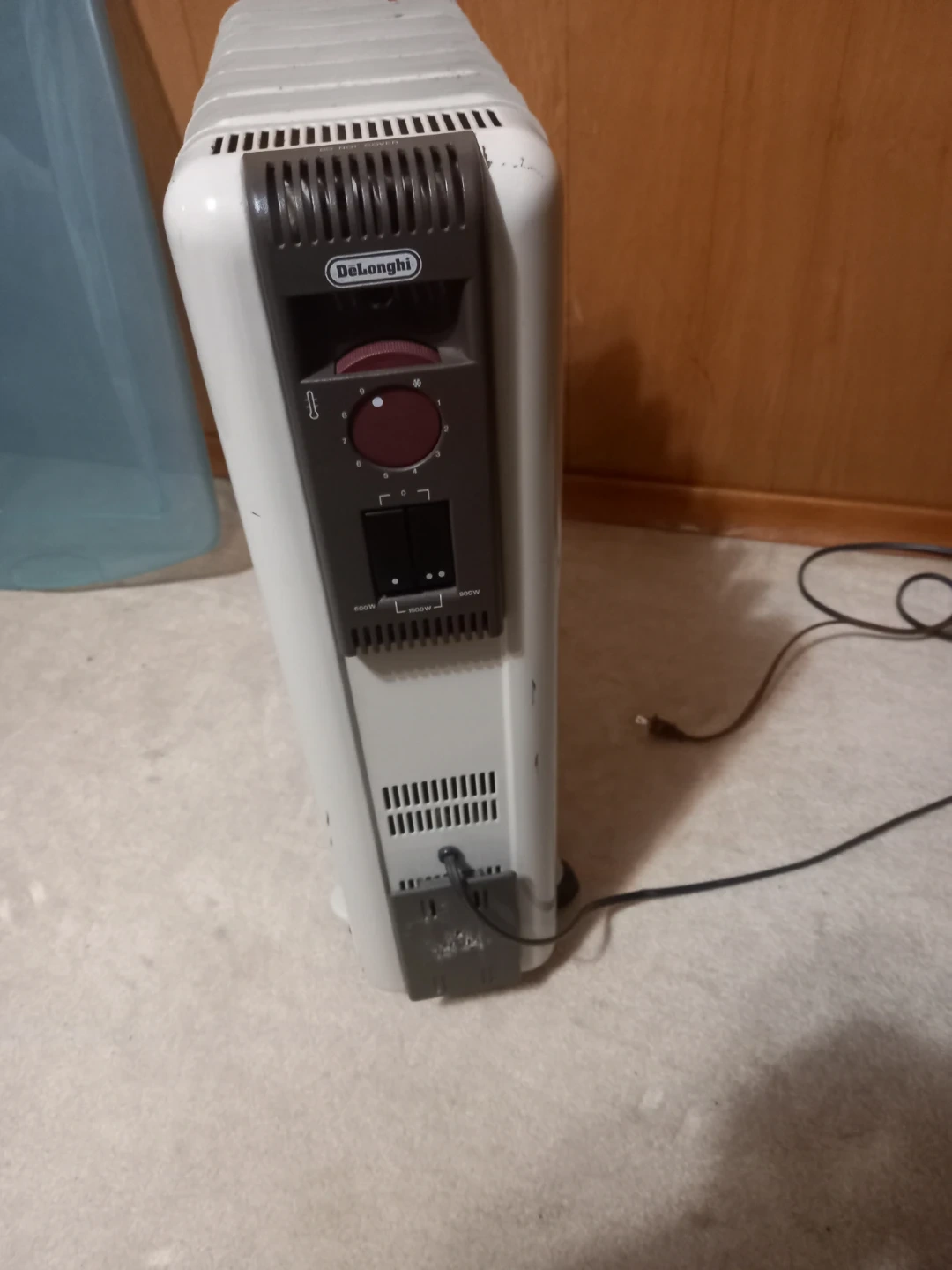 A DeLonghi oil-filled radiator heater. It has a thermostat dial and multiple heat settings, including 600W, 1500W, and 900W options. Great for keeping a room cozy!