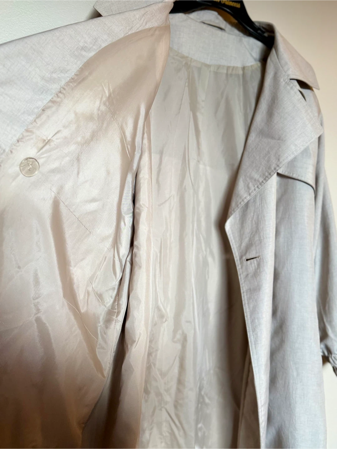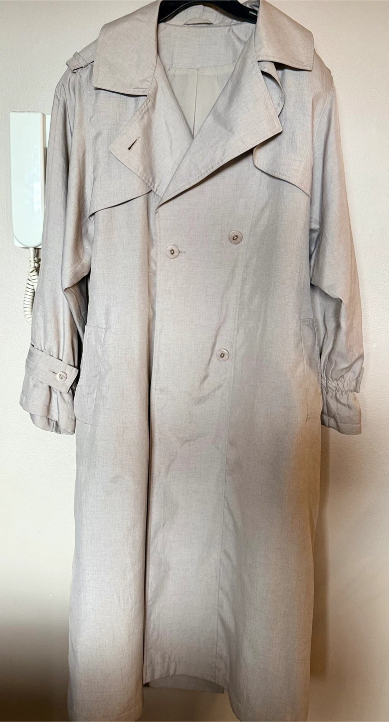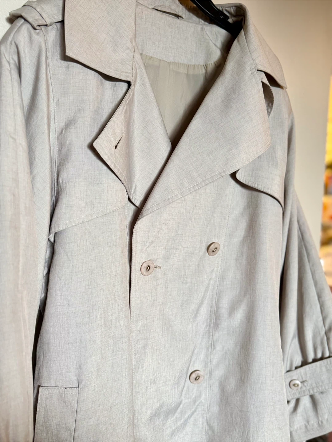 Classic beige trench coat with a double-breasted closure. Features a stylish lapel and button detailing. The sleeves have elasticated cuffs. It's a versatile piece for any wardrobe!