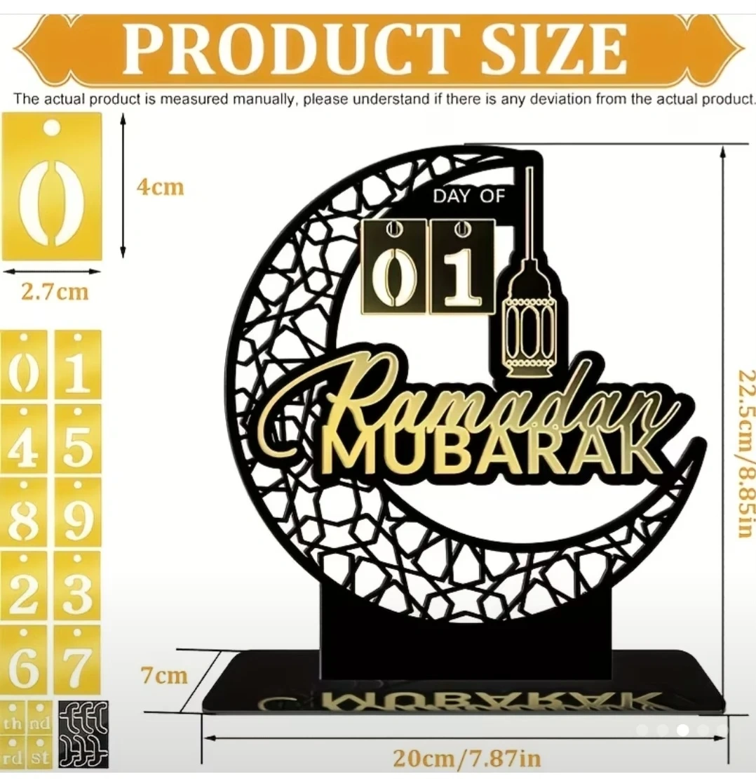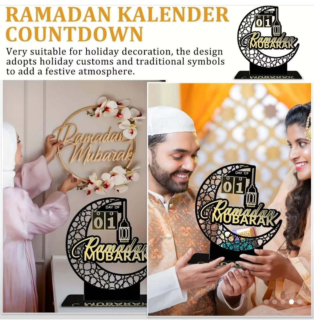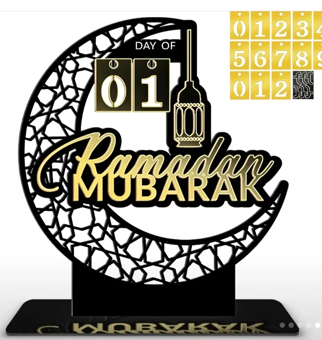 This Ramadan Mubarak countdown calendar features a moon design. It's made of high-quality acrylic with a clear pattern. The calendar comes with numbers to mark each day. Great for holiday decoration!