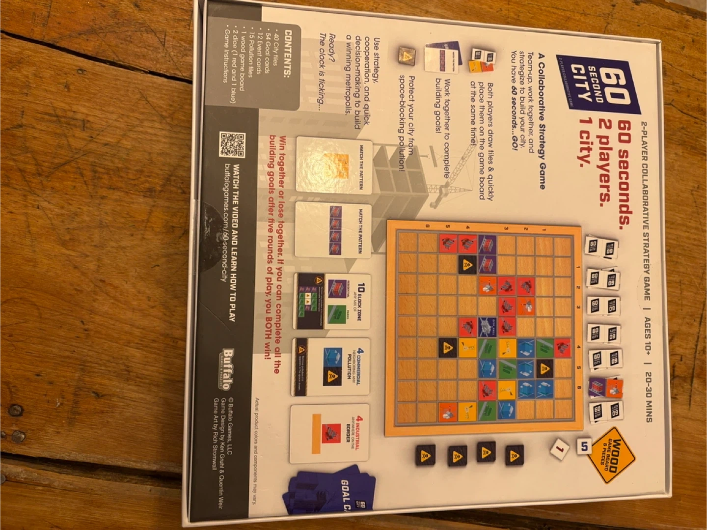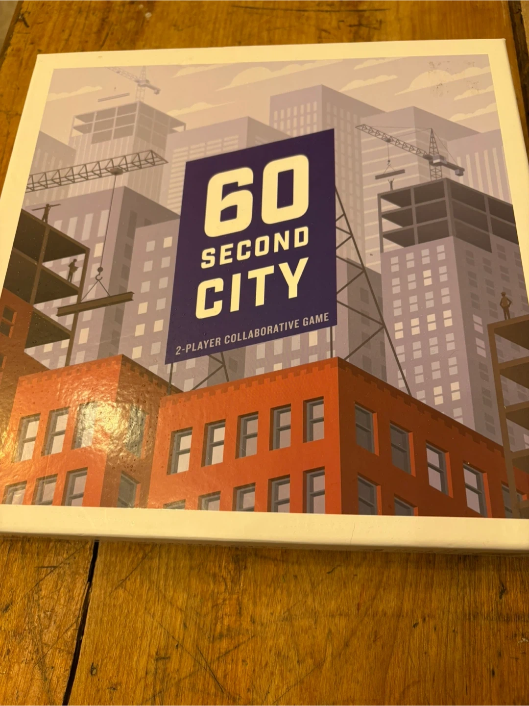 Selling a new copy of 60 Second City 2-player collaborative strategy game. It's a decision-making game where you build a winning city. Includes game board, 64 cards, 50 coins, and game instructions. NIB