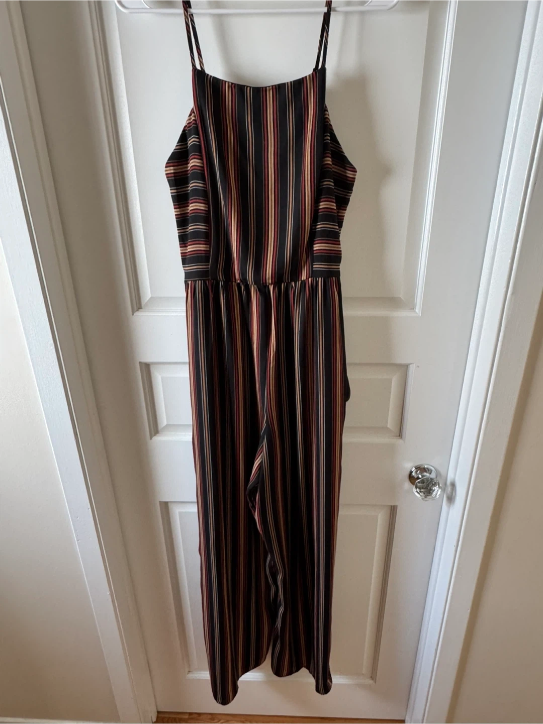 This is a cute striped jumpsuit from Xhilaration! It's a size small and features a vertical stripe pattern. Perfect for a casual day out or dressed up for an evening event
