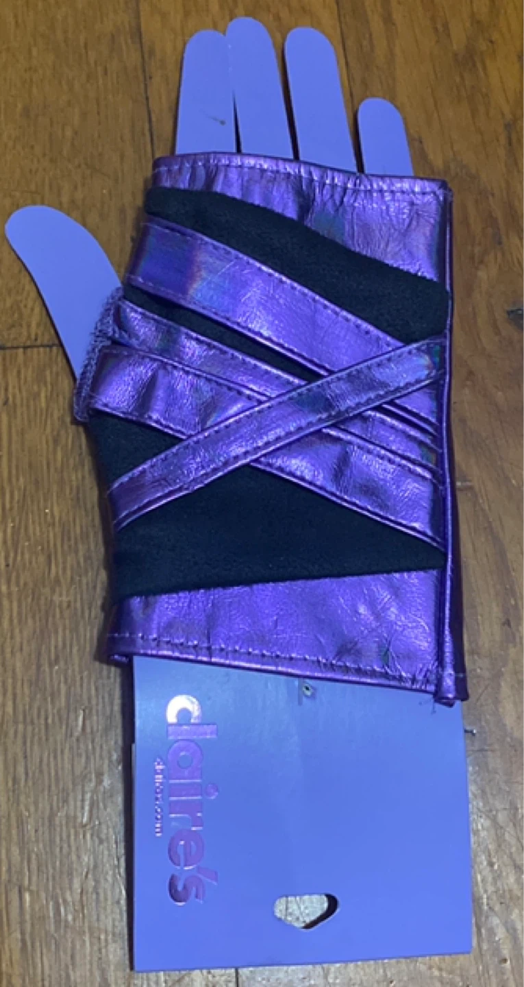 These fingerless gloves from Claire's are a fun and stylish accessory! They feature a cool purple metallic finish and black accents. They are new with tags!