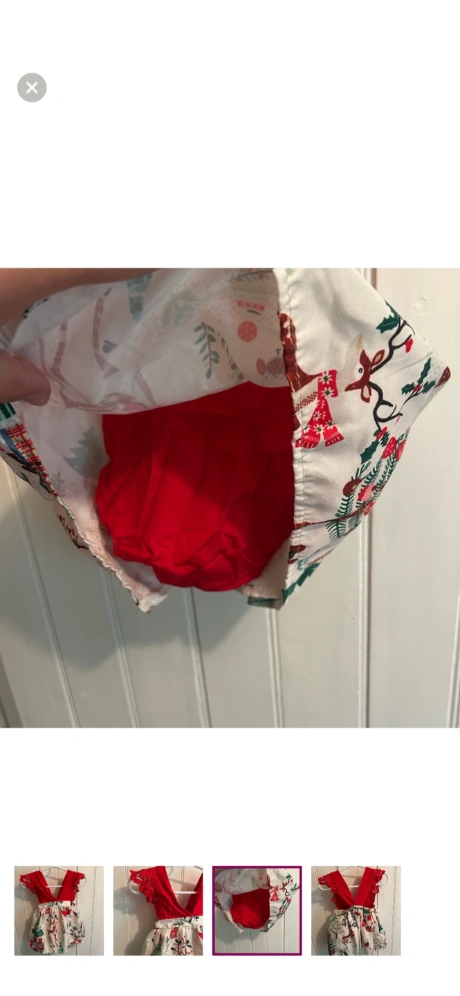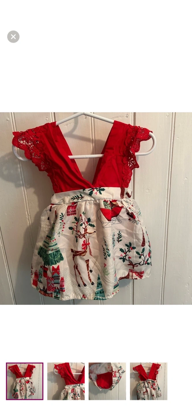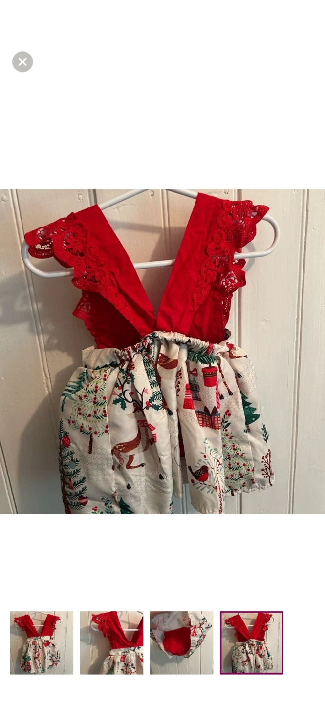 Small shop. Lace sleeve dress, romper bummies under skirt. Red with Christmas print skirt. Size 6/9m. Brand new condition