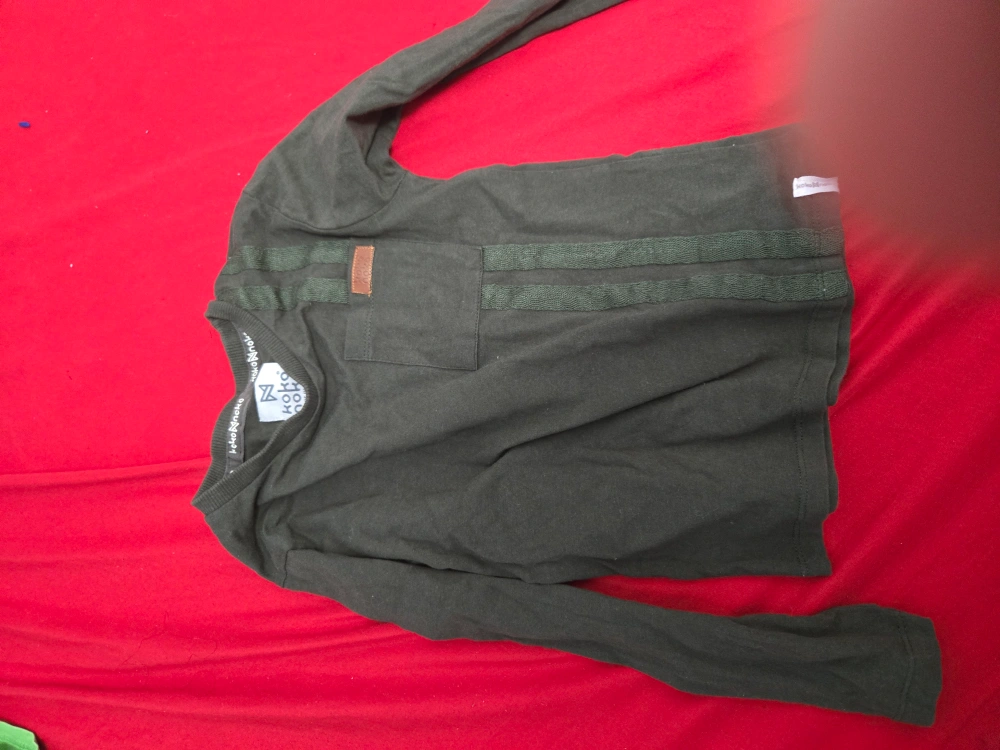 A gently used koko noko long sleeve shirt in a dark green colour. It features two decorative stripes and a small pocket on the front. Perfect for casual wear!