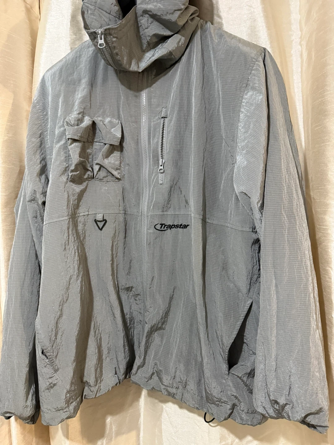 Selling a Trapstar jacket in an iridescent grey colour. It's in great shape and has a cool, unique look with the reflective material and subtle branding. Perfect for adding a bit of style to your wardrobe!