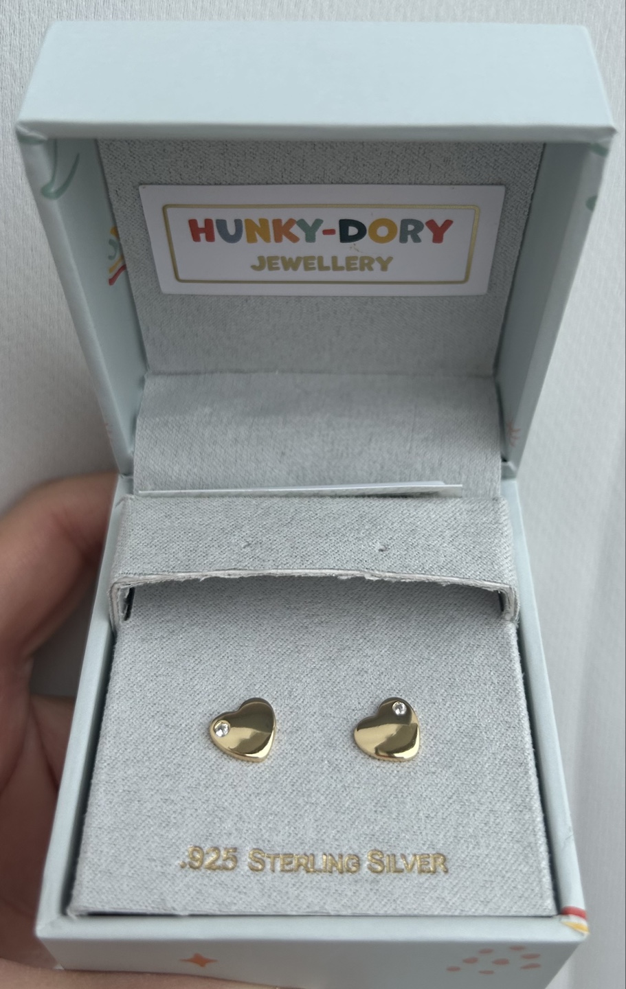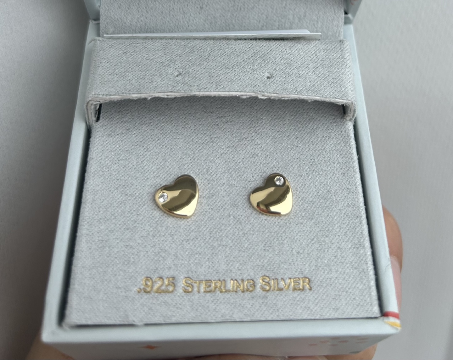 Adorable heart-shaped earrings. New gold-plated 925 sterling silver heart stud earrings with clear cubic zirconia stone. Perfect gift with box.