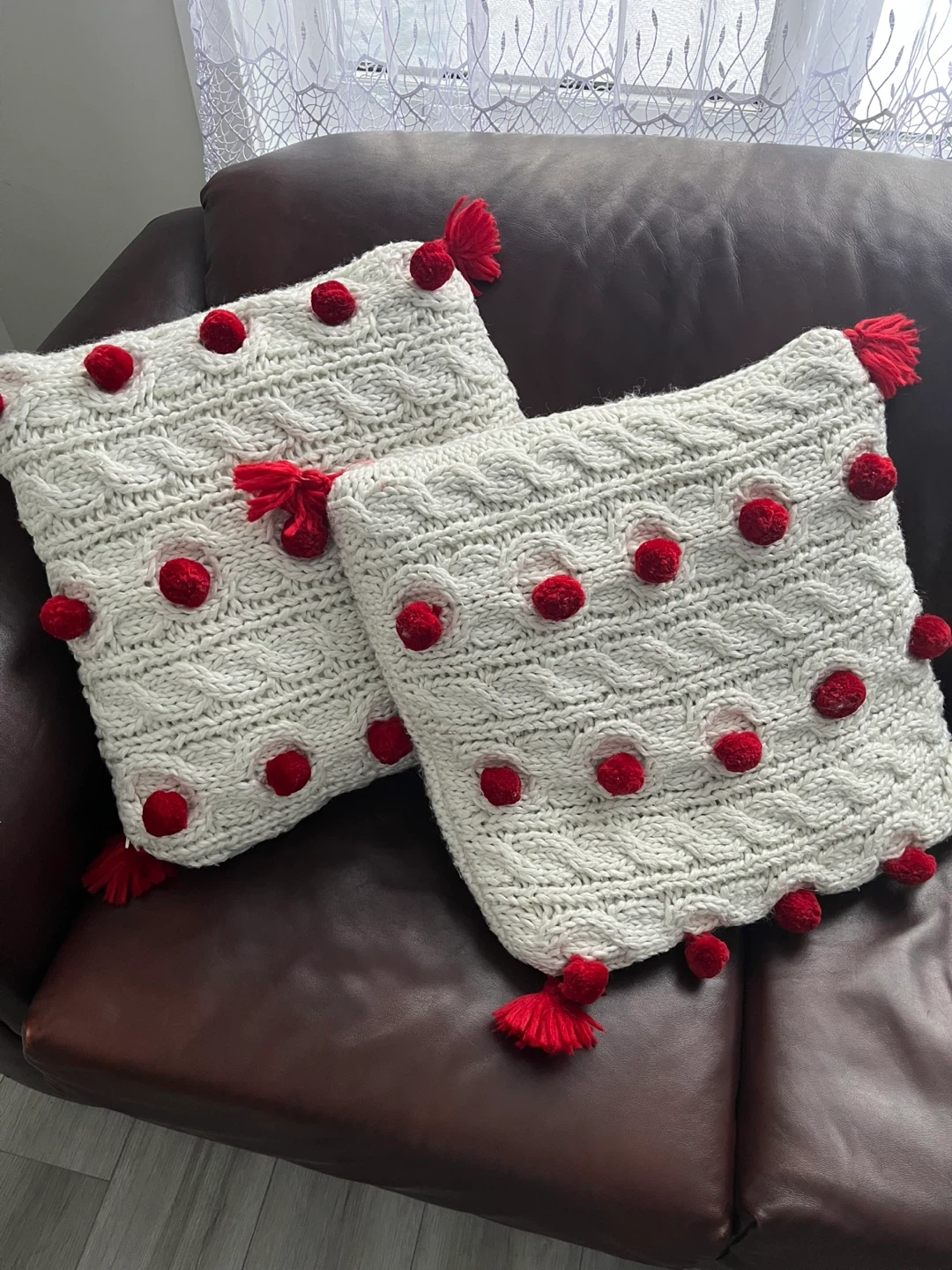 These decorative throw pillows are in great condition and would be a cozy addition to any living space! They feature a knit texture with red pom-poms and tassels, adding a touch of fun and warmth to your home decor