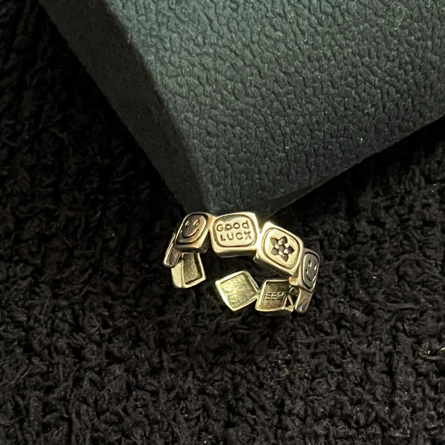 Selling a cute ring with 'Good Luck' and smiley face details! It's in great condition and ready for a new owner