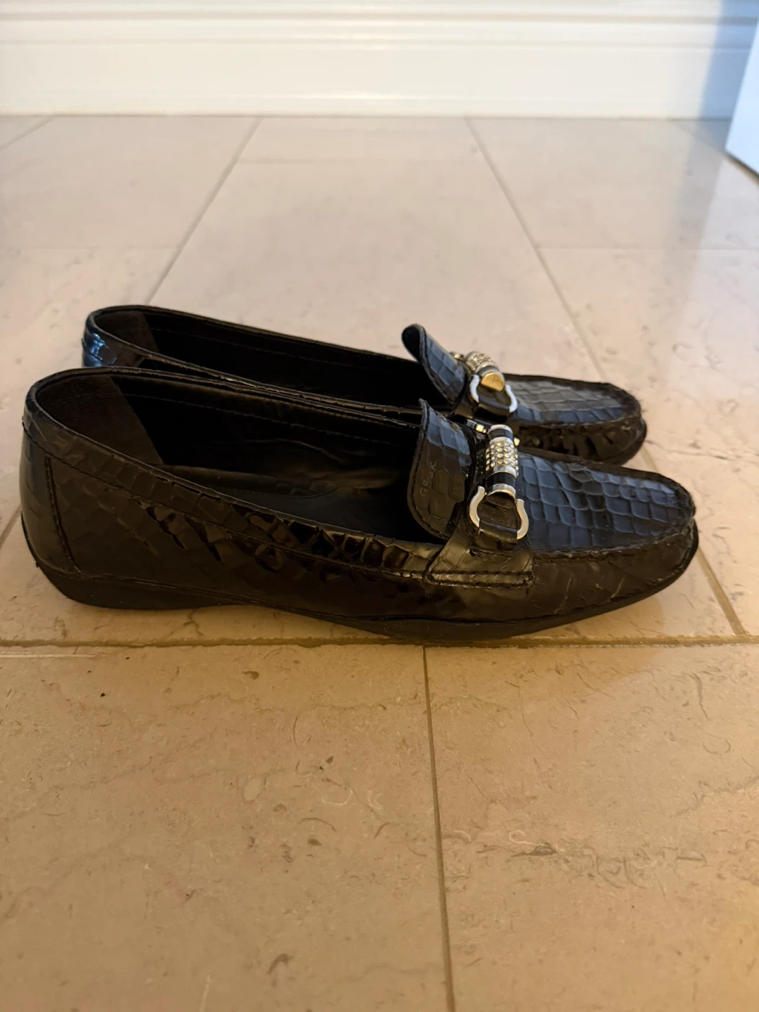 Black patent leather loafers with a croc print and silver buckle detail with gorgeous tiny stones. Made by Geox Respira. Includes original box. Size 8 women's size with rubber soles.