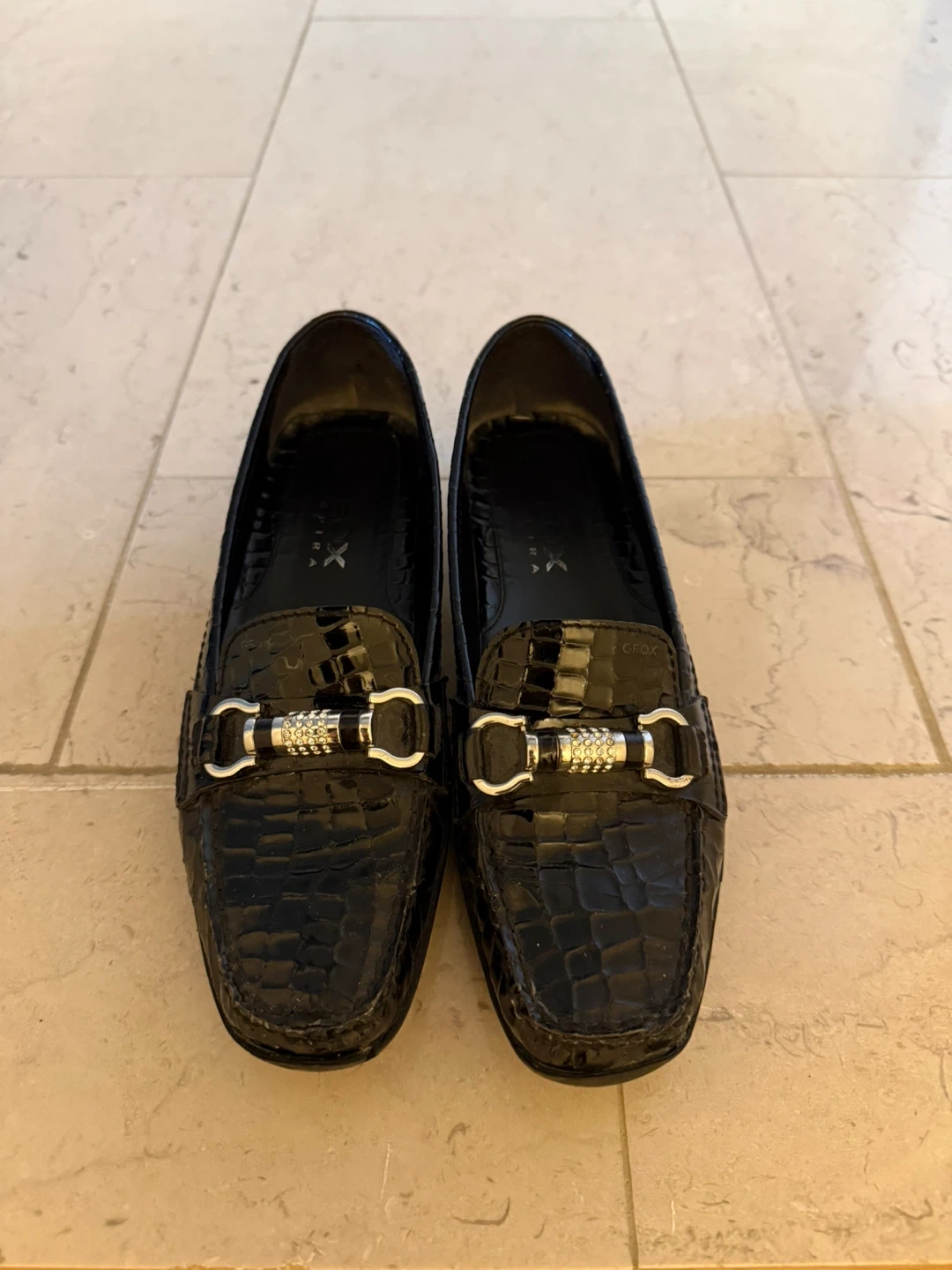 Black patent leather loafers with a croc print and silver buckle detail with gorgeous tiny stones. Made by Geox Respira. Includes original box. Size 8 women's size with rubber soles.