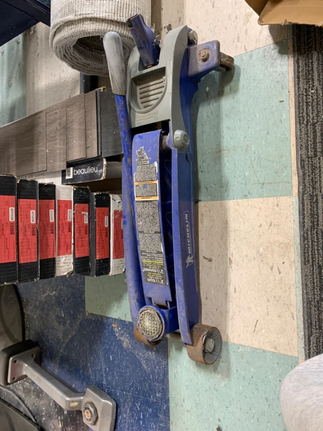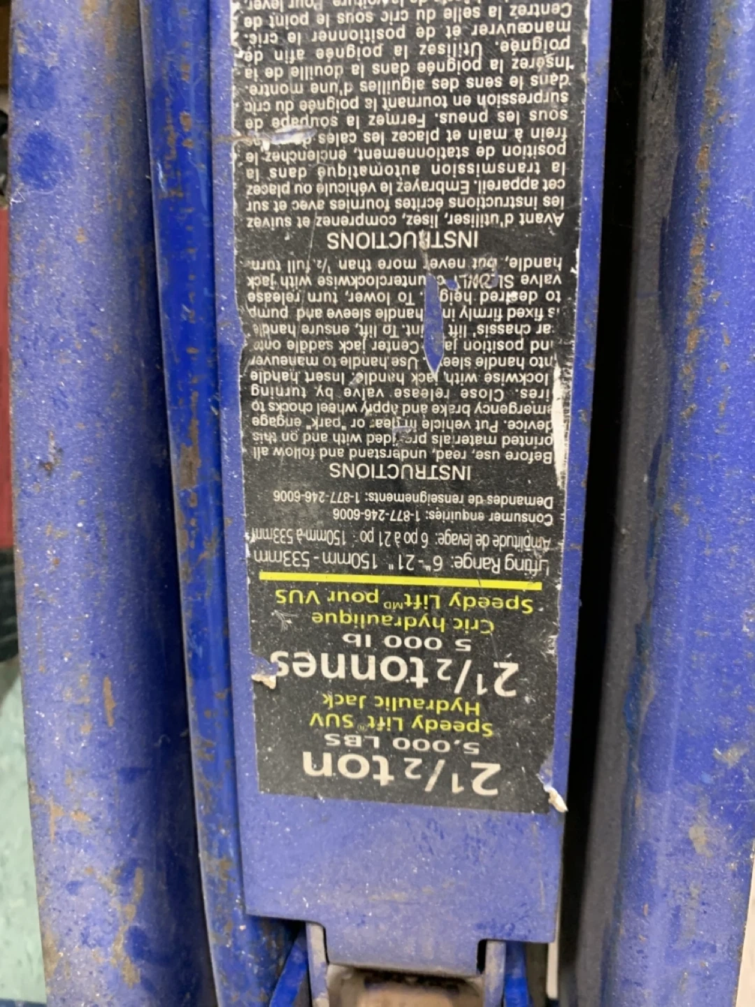 This is a Michelin Speedy Lift hydraulic floor jack. It has a lifting capacity of 5,000 lbs or 2.5 tons. The jack is blue and silver and features a handle for operation. It includes instructions on the side.