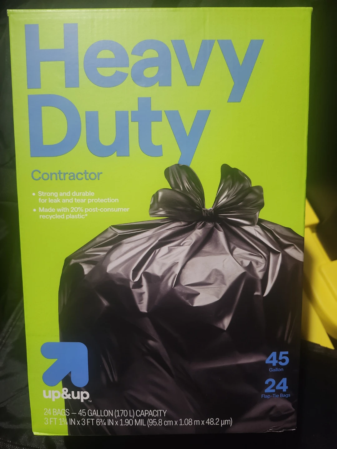 These Up & Up heavy-duty contractor trash bags are strong and durable, offering leak and tear protection. They're made with 20% post-consumer recycled plastic. Each bag has a 45-gallon capacity. Includes 24 flap-tie bags.