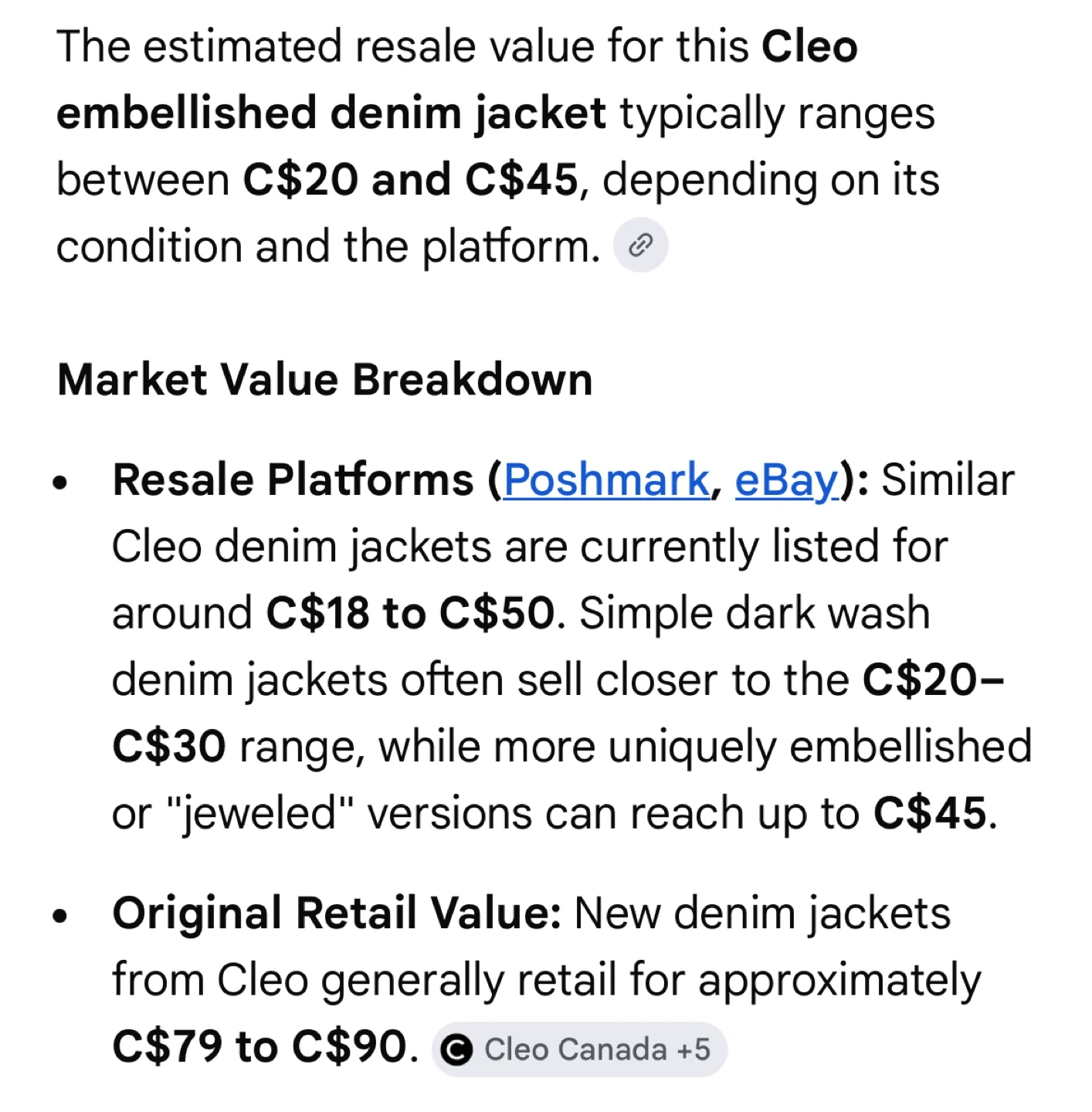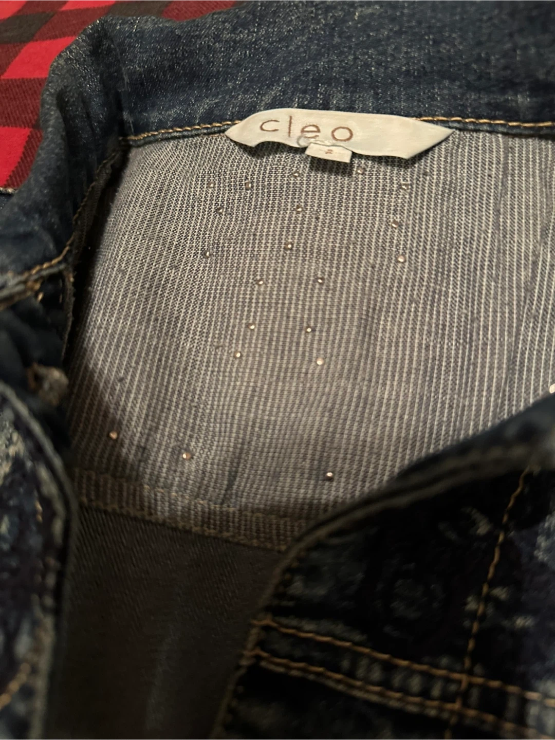 This Cleo denim jacket has a classic blue wash with decorative pearl and rhinestone embellishments on the shoulders and back. It features a traditional collar, button-up front, and chest pockets. This stylish jacket is perfect for adding a touch of sparkle to any outfit!