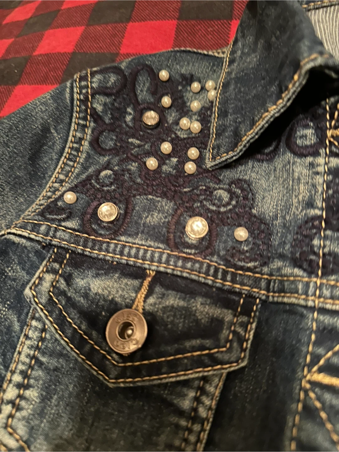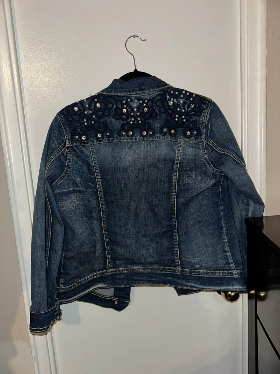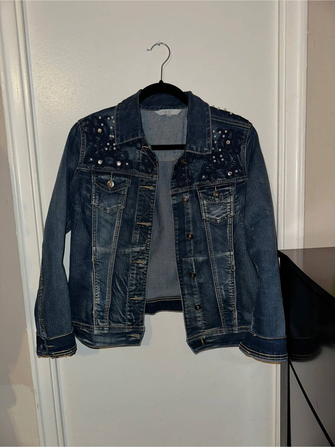 This Cleo denim jacket has a classic blue wash with decorative pearl and rhinestone embellishments on the shoulders and back. It features a traditional collar, button-up front, and chest pockets. This stylish jacket is perfect for adding a touch of sparkle to any outfit!
