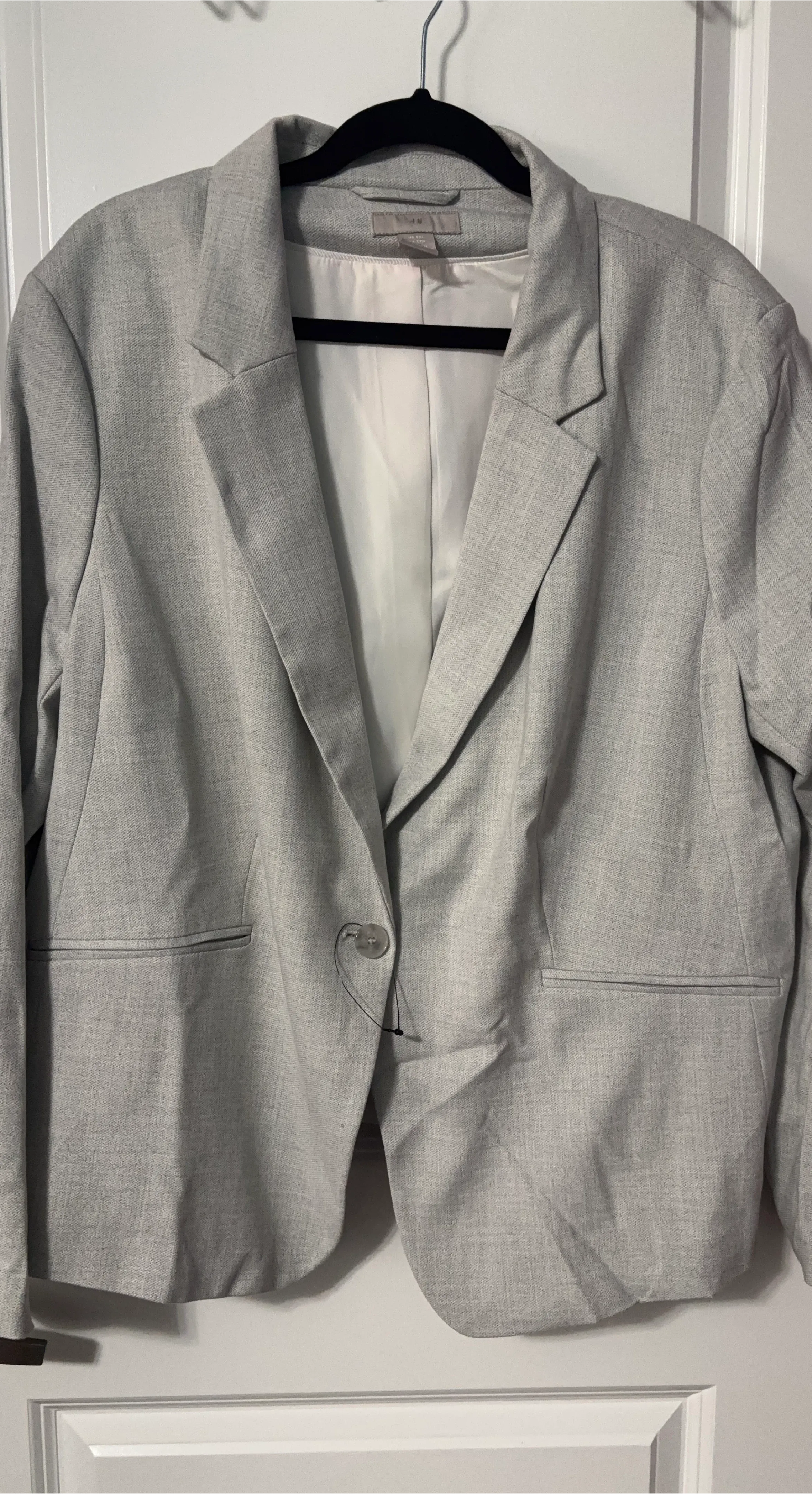 Light grey blazer by H&M. It's a size 12, made from a linen blend. Features a single button closure and two front pockets. Perfect for dressing up or down!