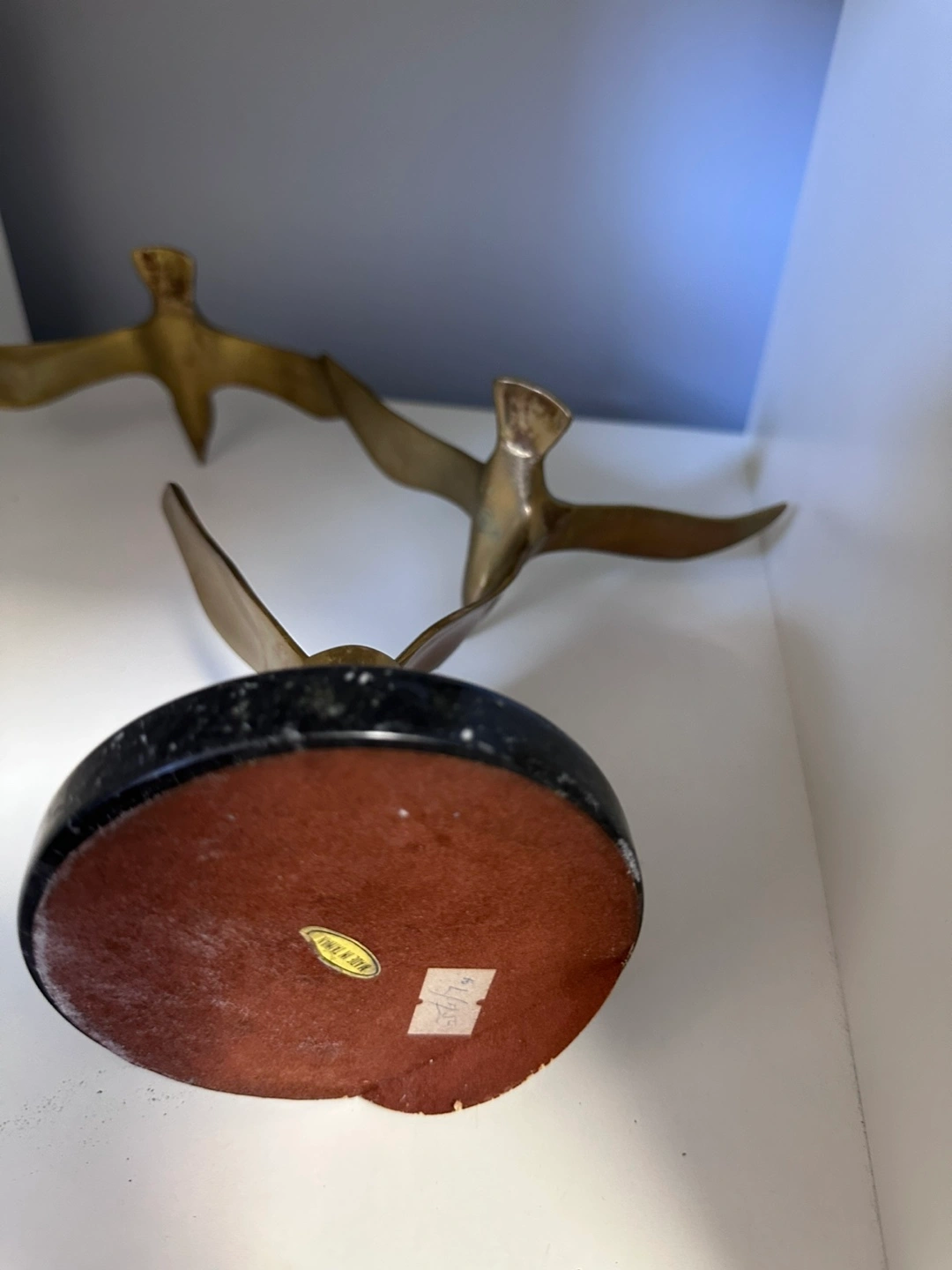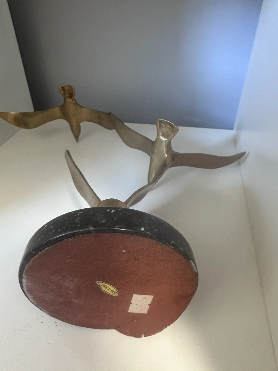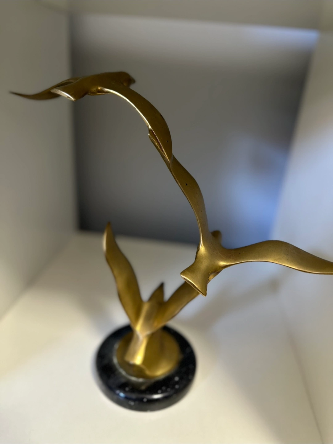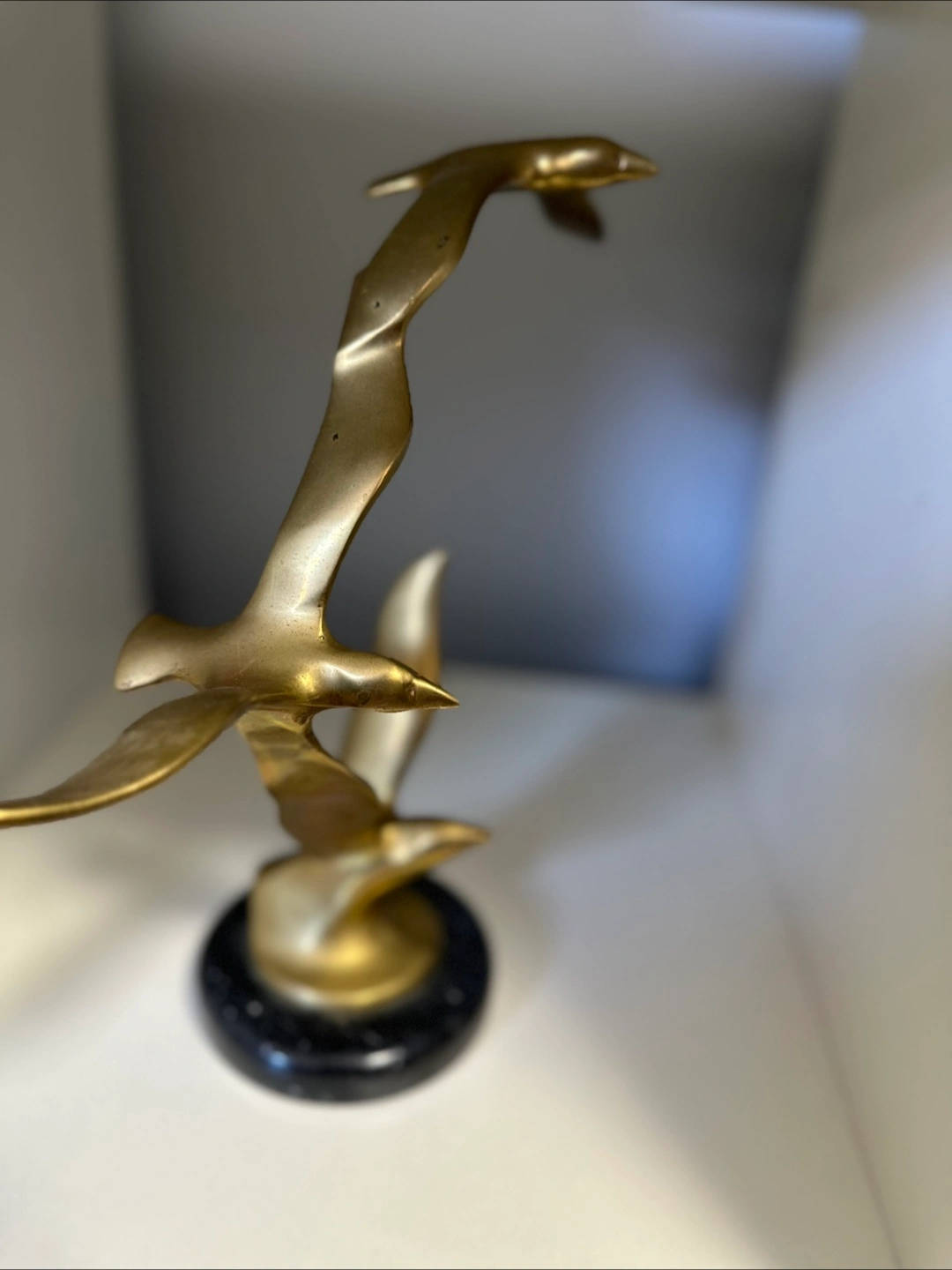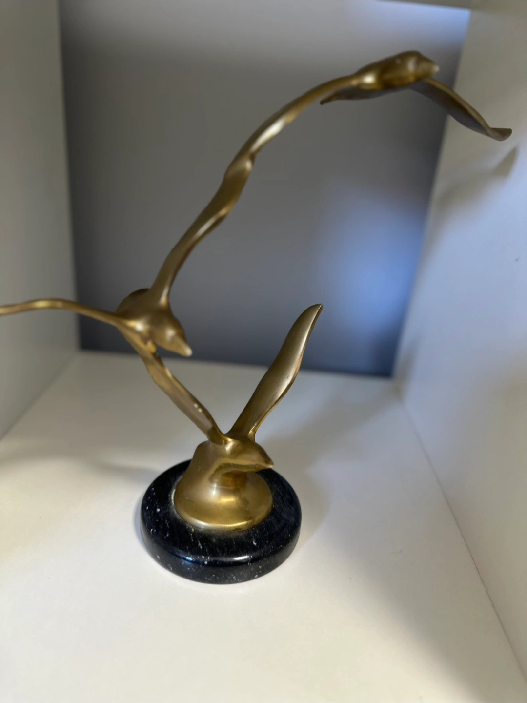 Here's a lovely vintage brass sculpture featuring three birds in flight! It has a black marble base and would make a great addition to any room