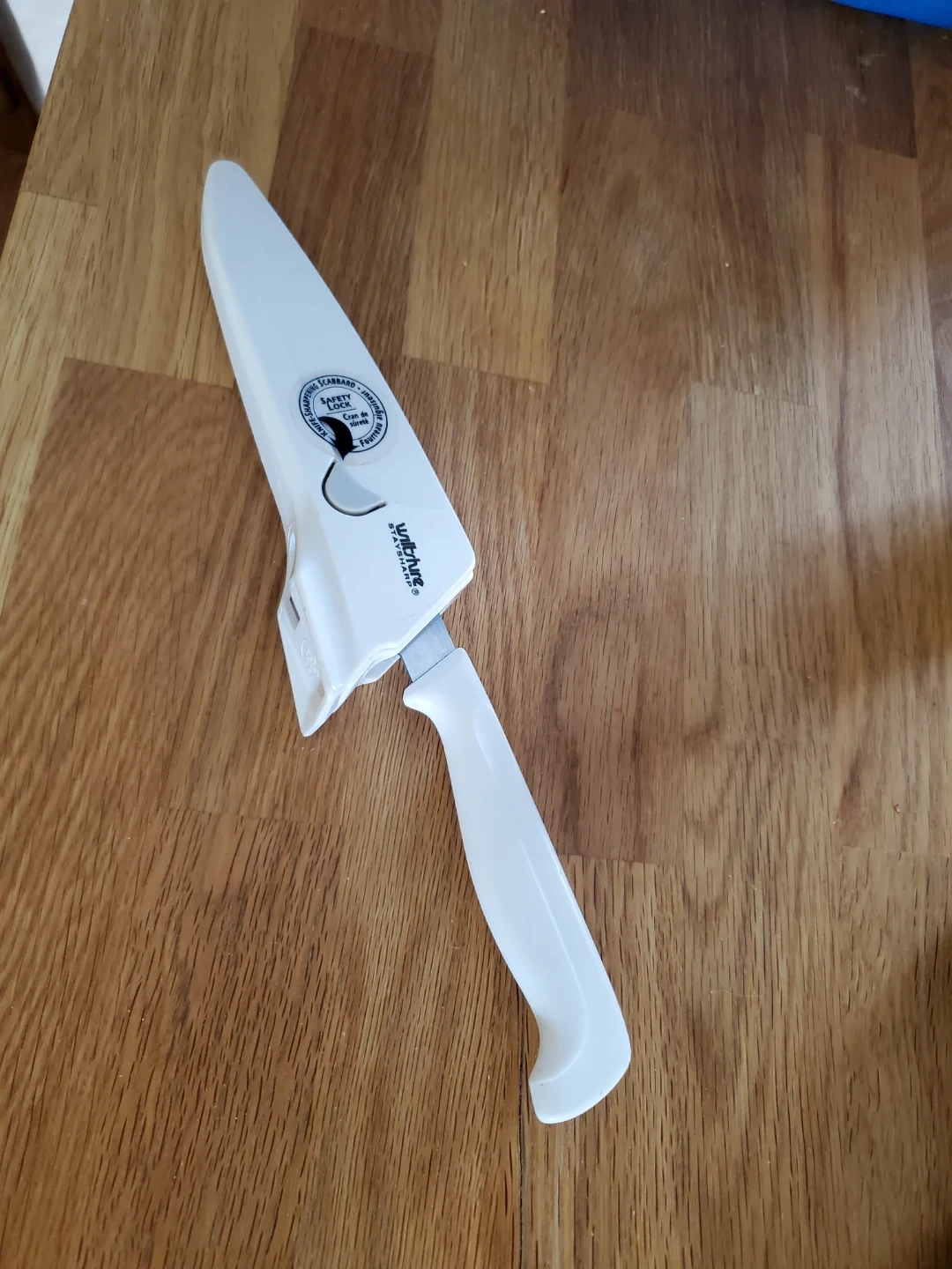This is a Wüsthof steak knife with a white handle. It comes with a white sheath that features a safety lock. It's designed for safe and easy storage.