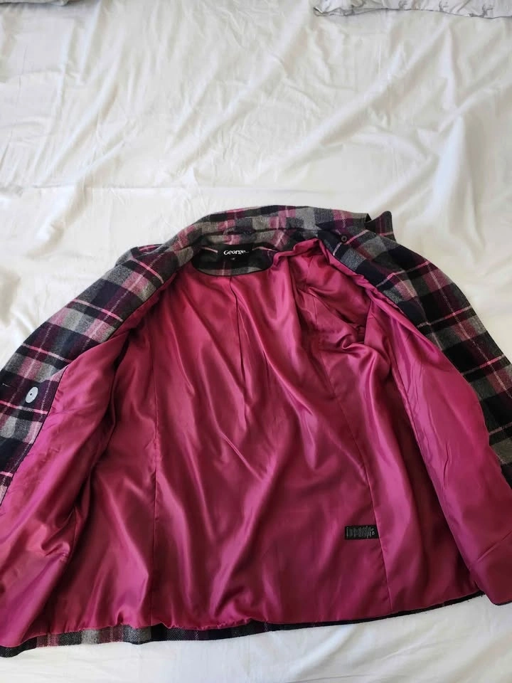 This George brand women's pea coat features a stylish purple, grey, and black plaid pattern with a vibrant pink inner lining. It is a Size Large and is made from a comfortable blend that includes wool. The jacket is in excellent condition from a smoke-free and pet-free home. Pick up is in Chestermere.