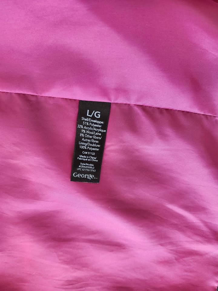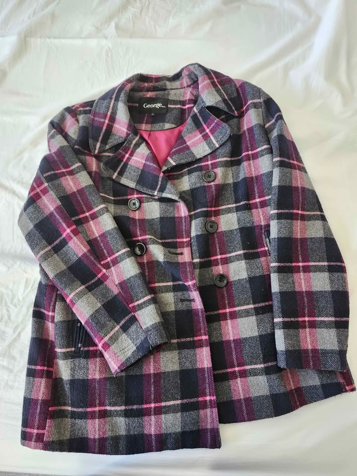 This George brand women's pea coat features a stylish purple, grey, and black plaid pattern with a vibrant pink inner lining. It is a Size Large and is made from a comfortable blend that includes wool. The jacket is in excellent condition from a smoke-free and pet-free home. Pick up is in Chestermere.