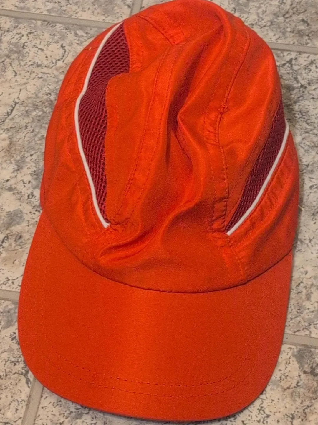 Bright orange baseball cap with mesh side panels for ventilation. It's lightweight and comfortable for everyday wear. One size fits most.
