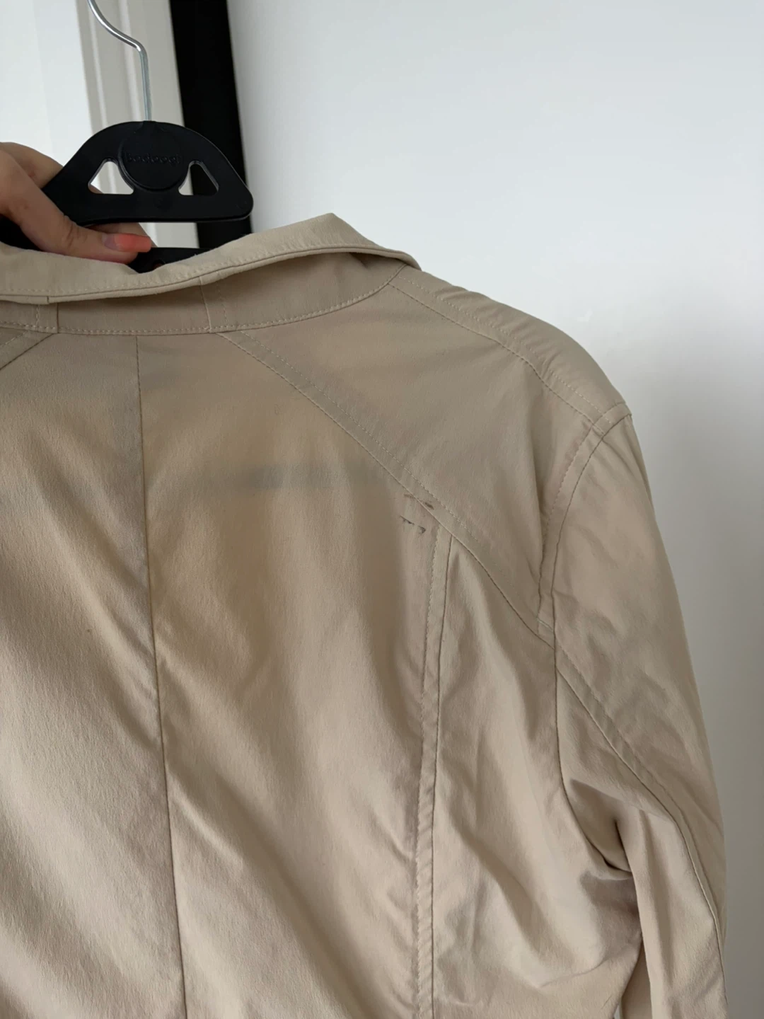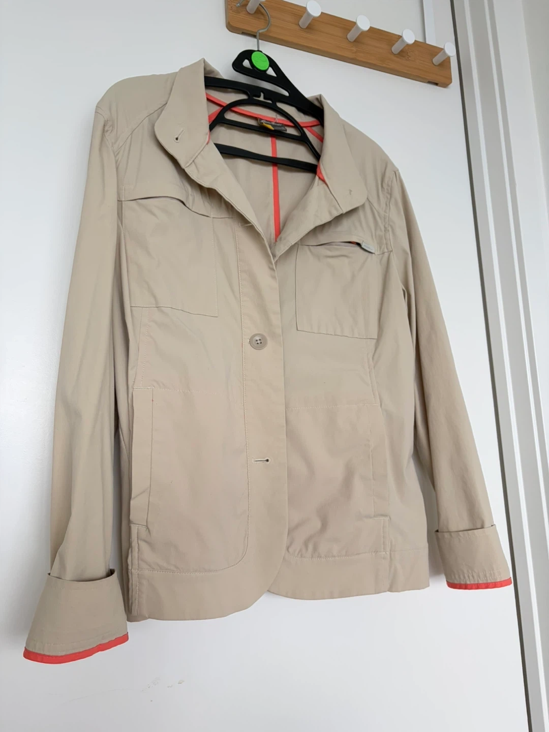 Eddie Bauer beige blazer with coral lining. Women's size 12 but fits more like loose medium. Made in Sri Lanka. Light stain on the back. Very comfortable