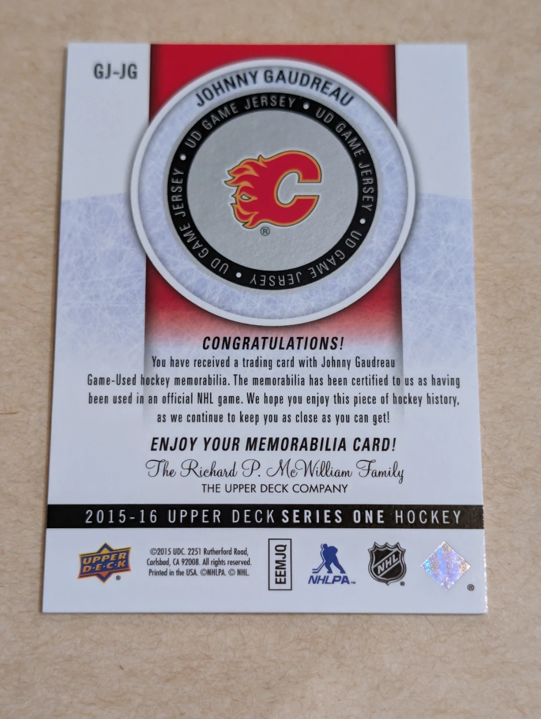 2015-16 Upper Deck Series One Hockey card featuring Johnny Gaudreau's game-used jersey memorabilia. This card is certified by Upper Deck. A great addition for any hockey memorabilia collector!